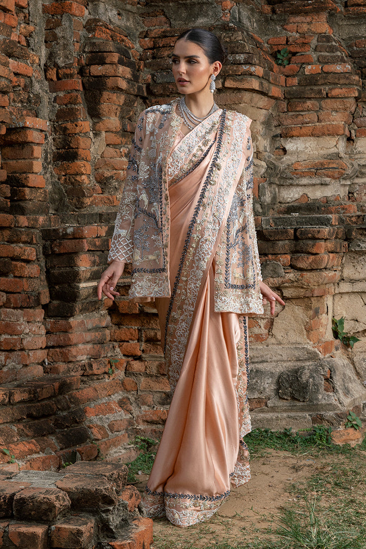 Effortlessly romantic, this saree in pale peach charmeuse silk tells a story of soft grandeur. Its pallu, animated with screen-printed motifs of whimsy, and beautifully contrasted by the texture of intricately placed sparkling sequins, beads, and crystals. Along its borders, geometric patterns with similar artisanal flourishes gleam softly. Paired with a matching silk blouse, with pleated accents and finished with handcrafted tassels. Adding layered intrigue, a short jacket in organza serves as both complement and contrast. Its sheer body, richly printed with Mughal-inspired chinoiserie, is heightened by hand encrusted crystals, sequins, beadwork. Together, the saree €™s effortless romance and the jacket €™s painterly canvas create an ensemble luminous and unforgettable.