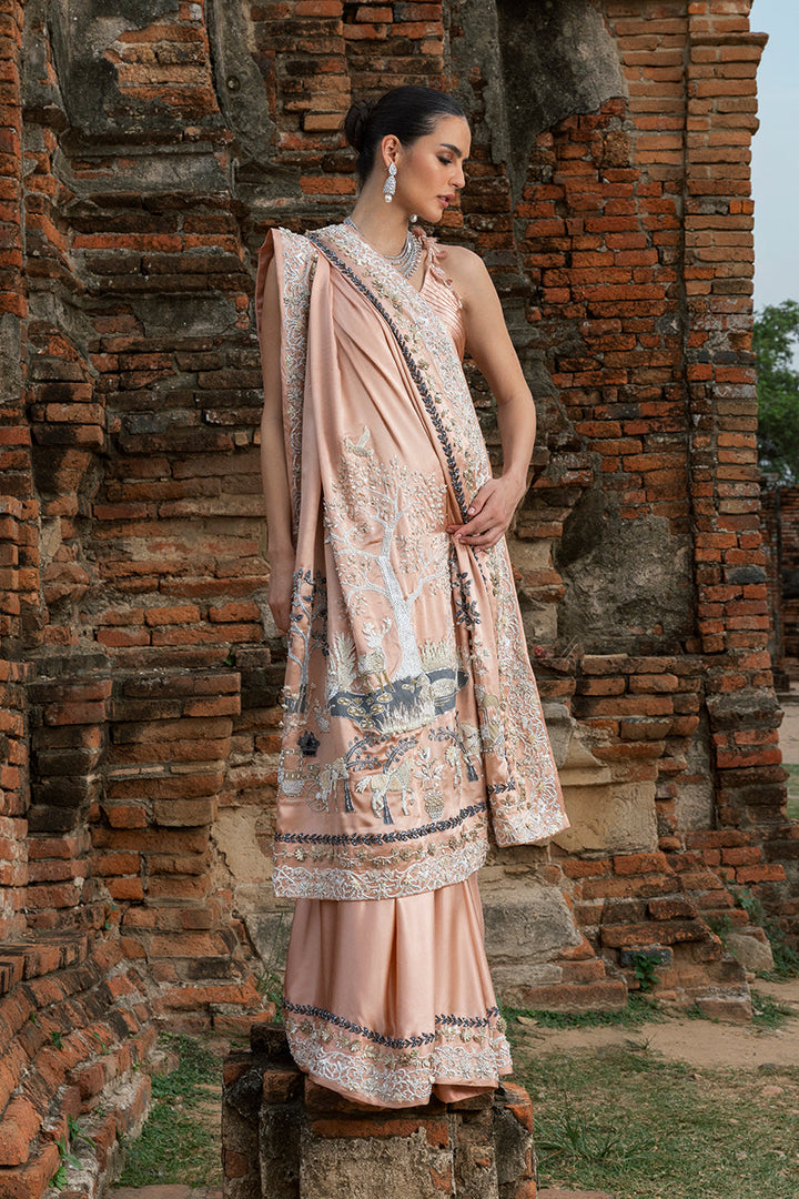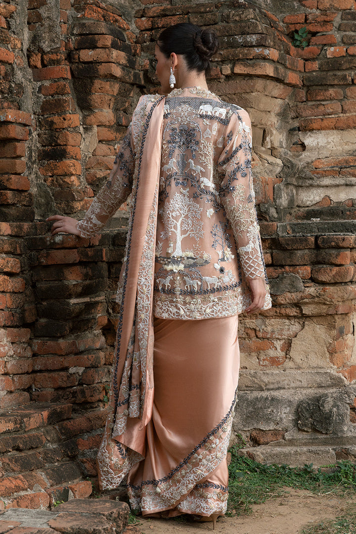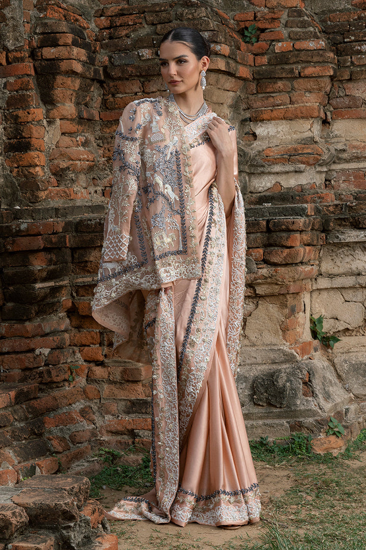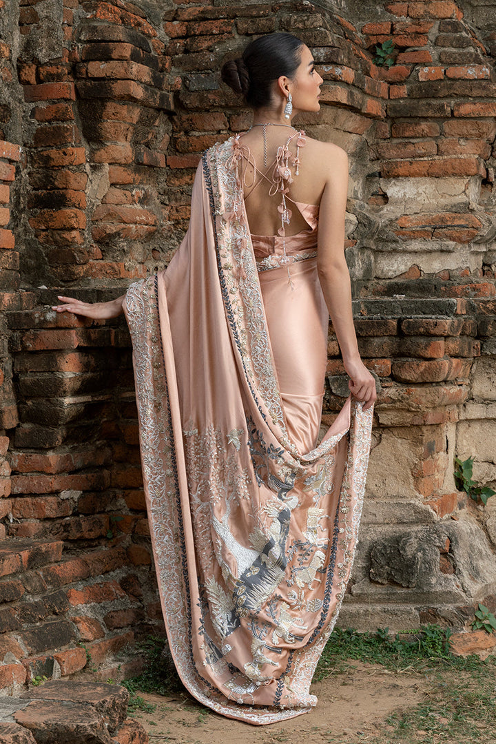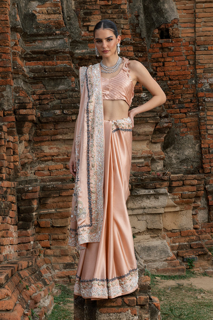 Effortlessly romantic, this saree in pale peach charmeuse silk tells a story of soft grandeur. Its pallu, animated with screen-printed motifs of whimsy, and beautifully contrasted by the texture of intricately placed sparkling sequins, beads, and crystals. Along its borders, geometric patterns with similar artisanal flourishes gleam softly. Paired with a matching silk blouse, with pleated accents and finished with handcrafted tassels. Adding layered intrigue, a short jacket in organza serves as both complement and contrast. Its sheer body, richly printed with Mughal-inspired chinoiserie, is heightened by hand encrusted crystals, sequins, beadwork. Together, the saree s effortless romance and the jacket s painterly canvas create an ensemble luminous and unforgettable.