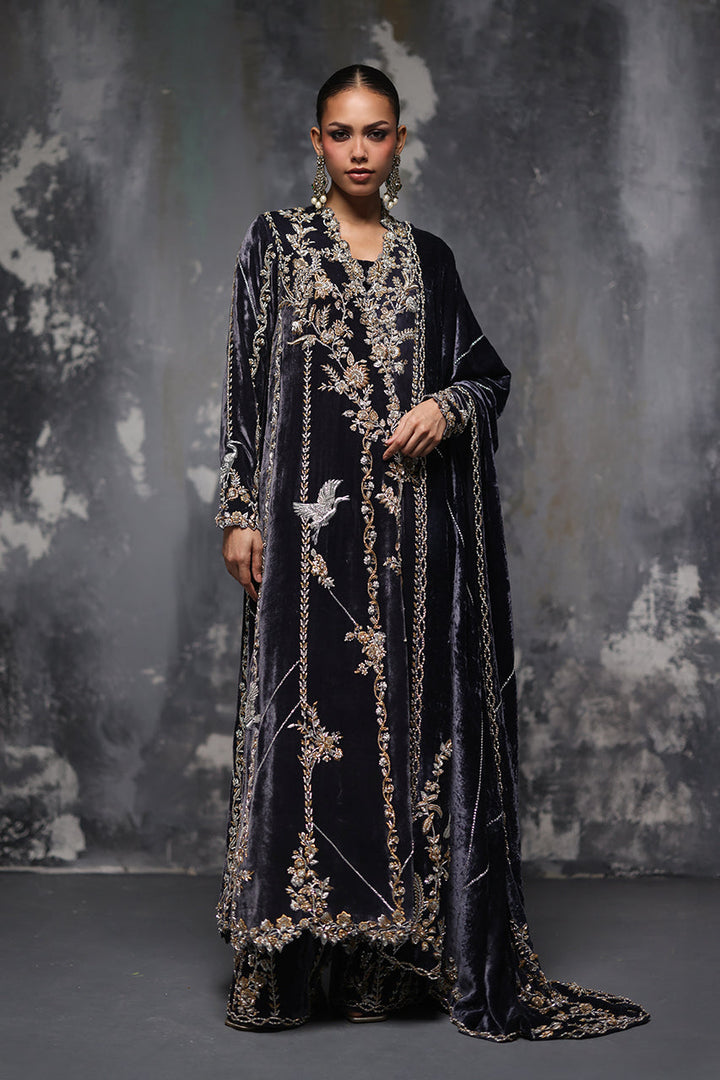 Echoing Mughal splendor, this four-piece ensemble in charcoal velvet tells a story of light meeting texture. The chogha carries handworked zardozi, sequins, and kamdani — every motif rendered in warm gold, copper, and silver. Floral vines descend from the shoulders into a fine lattice of geometry, birds, and bouquets in a glimmering symphony. Artfully arranged florals trace the neckline, flowing down the front-open form. The cuffs match the rhythm, while the sleeves are patterned with more floral details. Framing the piece, florals edged in cutwork line the hem, tying back into the organic definition and movement on the sleeves, neckline, and placket. The matching izaar and solid camisole balance the richness above, with a shimmering nod on the izaar hems, matching in form and craft. Completing the vision, a velvet dupatta, bordered in matching handwrought geometries with blooming florals and birds at each corner, is a modern ode to royal ateliers and the patience of hand embroidery.