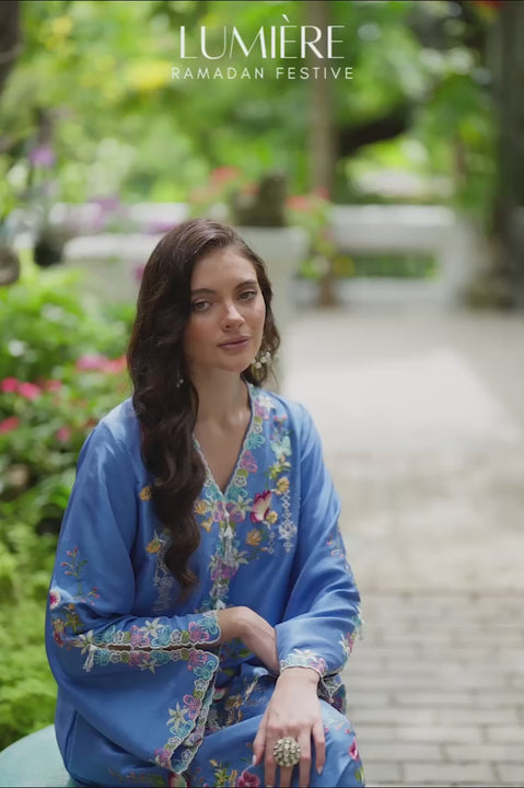 This piece feels like glee stitched into a kaftan — the kind that feels effortless, like sunlight spilling across a floor. Its blue silk is bright but calm, letting the embroidery sing in a medley of colors. Florals and butterflies cluster at the neckline, while floral vines and geometric motifs wander down the length in a painterly drift. The sleeves are touched with cutwork and beaded flourishes, details that lend quiet refinement, while beaded tassels at the placket add charm and dimension. It is a piece made for days when you want to radiate joy.