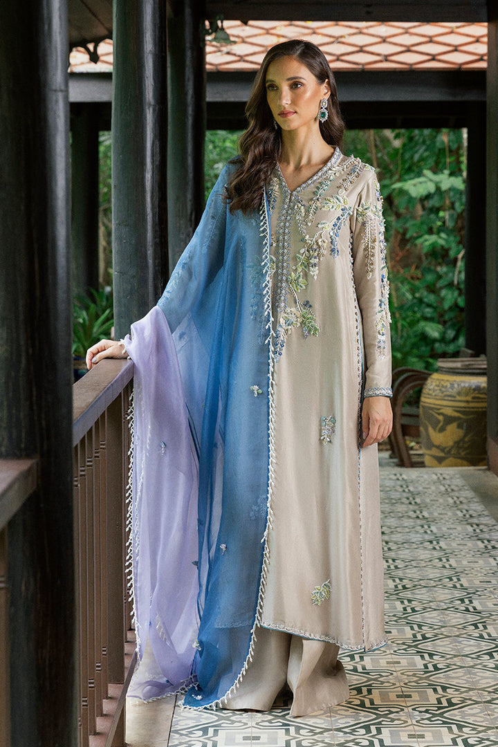 Pastel yet striking, this ensemble creates drama from delicate handwork and dimensional flourishes. The straight kurta in almond beige silk glistens with hand embroidered wisteria vines, crafted from crystals, fabrication, beads, sequins, and hints of silver zardozi. Soft-hued florals trace down from the shoulders in natural asymmetry, tapering into lighter bouquets scattered below the bodice. The sleeve cuffs, side seams and hem sparkle with sequined floral borders, dimensional yet delicate. Silk bell-bottom pants ground the composition, their cut elongating the silhouette. The two-tone dupatta, organza shifting between lilac and