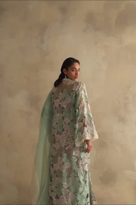 Embrace elegance with this stunning embroidered organza kurta, featuring floral cutwork in three delicate shades. The neckline showcases intricate 3D handwork in ivory, embellished with fabric flowers, crystals, beads, and pearls. Paired with a three-tone green organza dupatta finished with lace and khaddi silk bootcut pants, this ensemble radiates grace and refined craftsmanship.