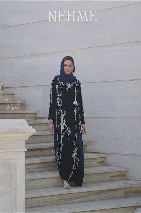 Refined and radiant, this navy set moves effortlessly from intimate gatherings to winter soirées. The velvet kaftan glimmers with patterned columns and floral arrangements, screen-printed and layered with hand-placed sequins, beads and crystals. Along the neckline, sleeves and length, organic asymmetry melts in with the sharp details of geometry. The flared cut brings graceful movement to velvet’s gravity, while the matching khaddi silk shella veils it in soft luminance. An elegant choice for evenings that call for poise and presence.