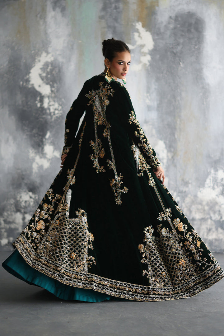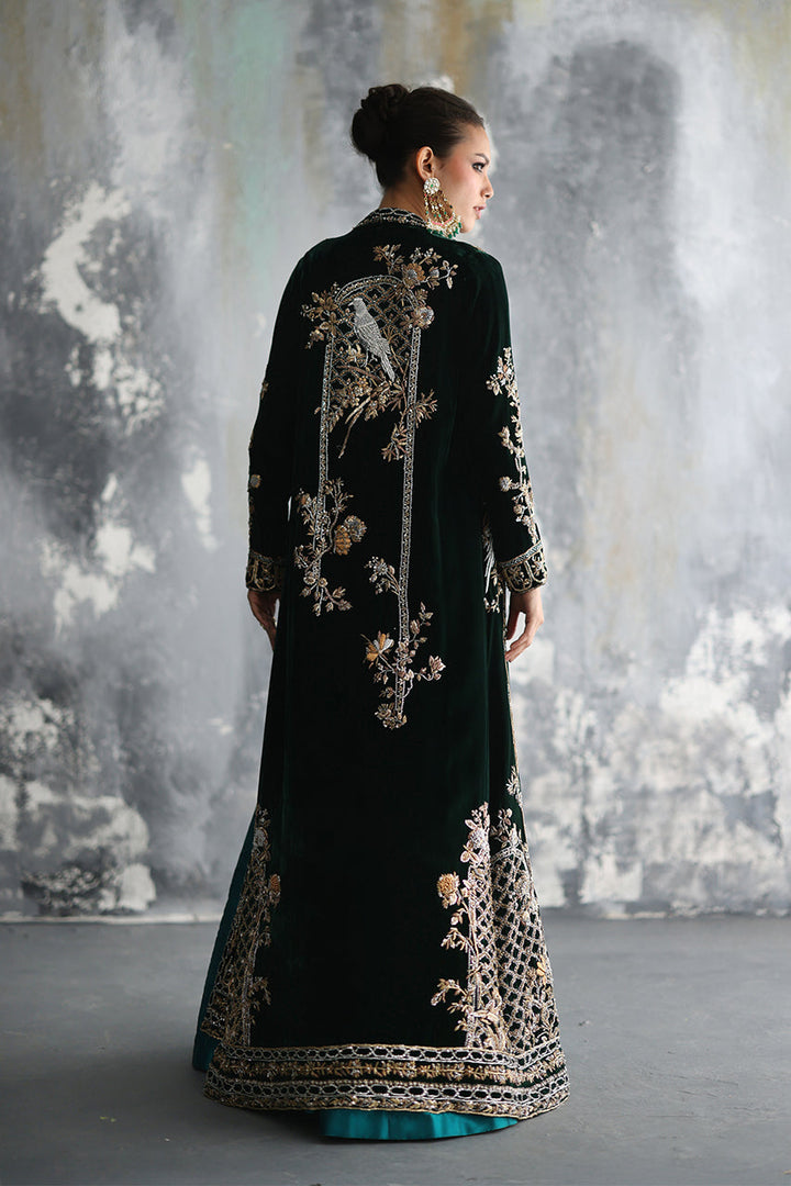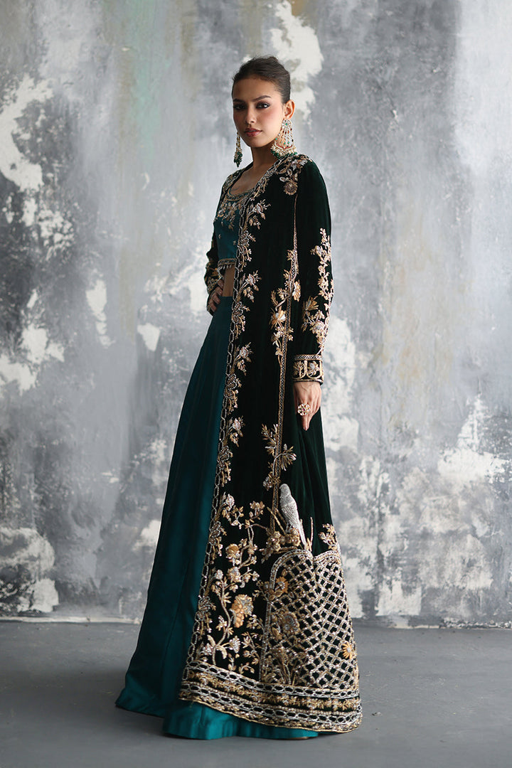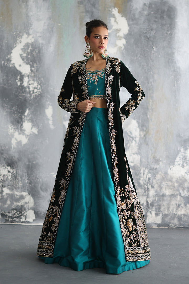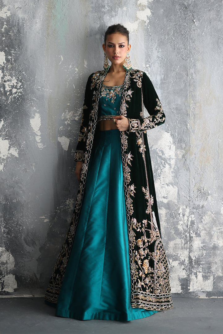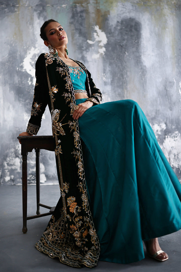 An ode to artisanal mastery — this three-piece couture look is ornate without being excessive. The deep green velvet jacket, A-line and floor-grazing, is adorned with hand-embroidered chinoiserie florals and avian motifs rendered in shimmering silver, gold, and copper threads. Bouquets bloom over the shoulders, merging into fine geometries tracing the neckline and length, their rhythm softened by delicate floral tendrils. The side seams glow with patterned bands, punctuated with florals and avian whimsy, culminating in a grand flowery trellis illuminating the flared hem. The sleeves continue the story of zardozi, kamdani, and sequins handwork — hours turned into shimmer. Beneath, a cropped teal katan silk blouse mirrors the jacket’s language, its neckline and hem traced with minute bands bordering floral tendrils, while crystal drops highlight the hem with their gentle swish. The paneled lehnga in matching katan silk completes the silhouette, its volume balancing the opulence above. The result: a statement refined through time, intention, and craft.
