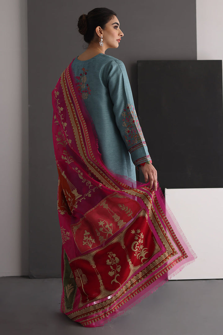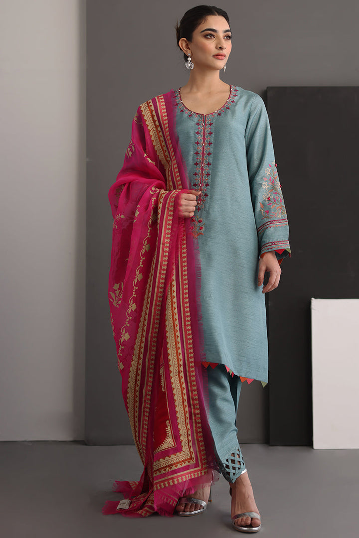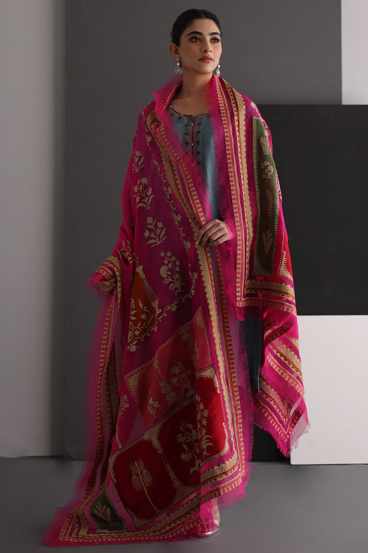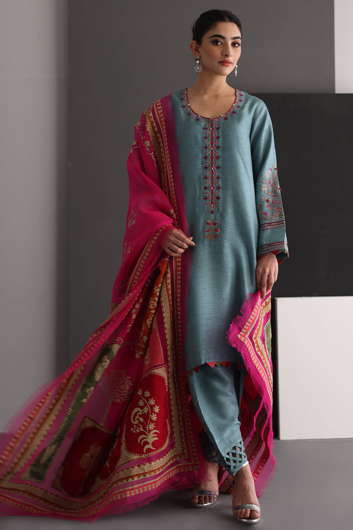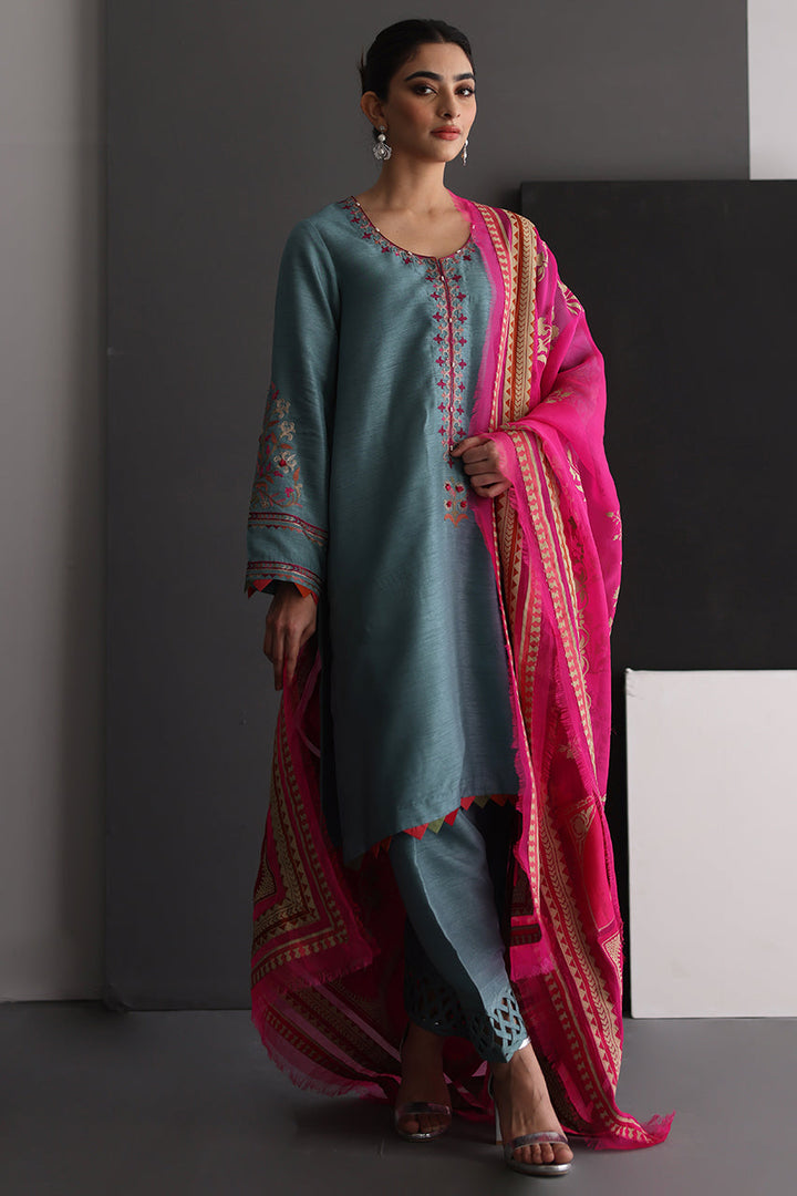 Bloom is an elegant embroidered shirt in a beautiful shade of stone blue with vivid embroideries, paired with an intricately textured shalwar and pure organza dupatta in hot pink with olive green and red patchwork . Perfect outfit to meet all the occasional needs of the season!