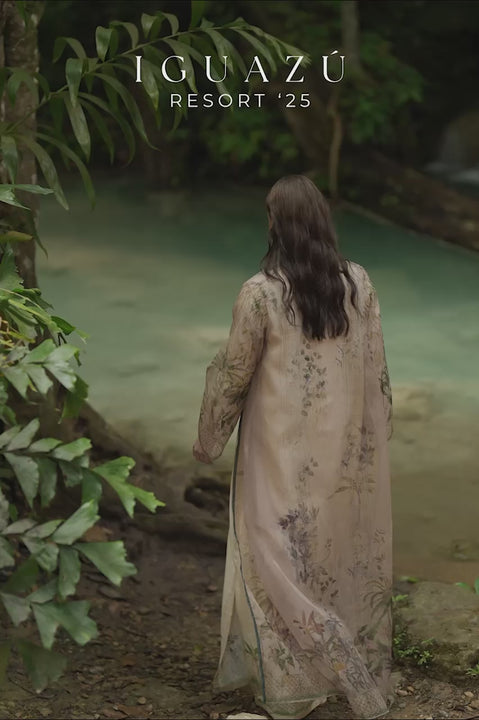 Soft cream silk forms a serene backdrop for green botanical motifs, while the band collar and tassel-adorned placket accentuate the kaftan’s understated sophistication. A sheer organza jacket overlays the print in delicate transparency, turning the ensemble into a visual poem of layered elegance.