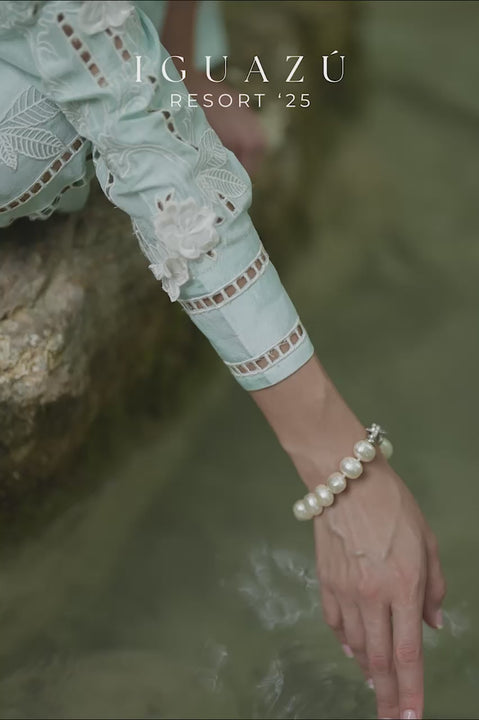 Tailored elements meet relaxed form in this co-ord. A collared button-down shirt with cuffed sleeves carries symmetry through its lines, while straight trousers bring in resort ease. The pure silk in aqua amplifies the set’s brightness, its sheen catching light with every move. White cutwork details, with embroidered and appliquéd florals, layer the silhouette thoughtfully, balancing craft against simplicity.