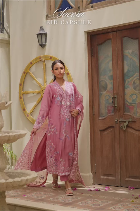 Delivery in 2-3 WeeksA soft, pretty pink brought to life with delicate floral detail. The pure kora silk chogha features embroidered a floral trellis on bodice and cuffs. Smaller vines trace the hem and a fine geometric border outlines every edge. The organza dupatta mirrors this blooming threadwork on its pallus, with geometric borders and handmade tassels framing the wispy layer. Paired with simple khaddi silk pants, the look is grounded with a clean, considered finish.