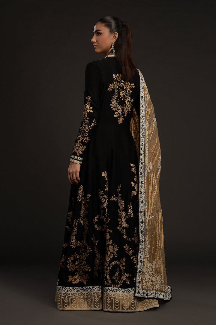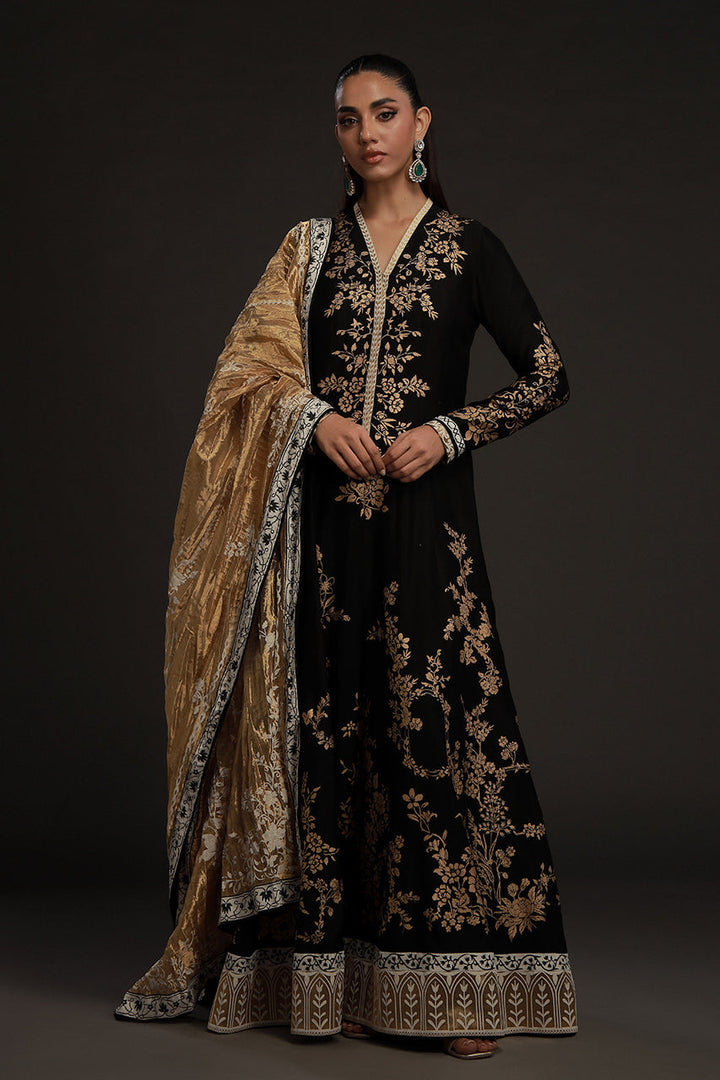 Dark and light meet in perfect harmony in this striking kalidar. Its rich black kora base is brought to life with gold screen-printed florals, thoughtfully placed along the neckline, sleeves, and sweeping hem to create a sense of rhythm. Ivory cotton silk and gold tissue borders finish the hem, amplifying the printed flourish and echoed in finer trims at the neckline and sleeves. The matching straight black pants keep the look grounded, while the gold tissue dupatta brings light, its screen-printed motifs delicately spaced and framed with ivory borders for balance.