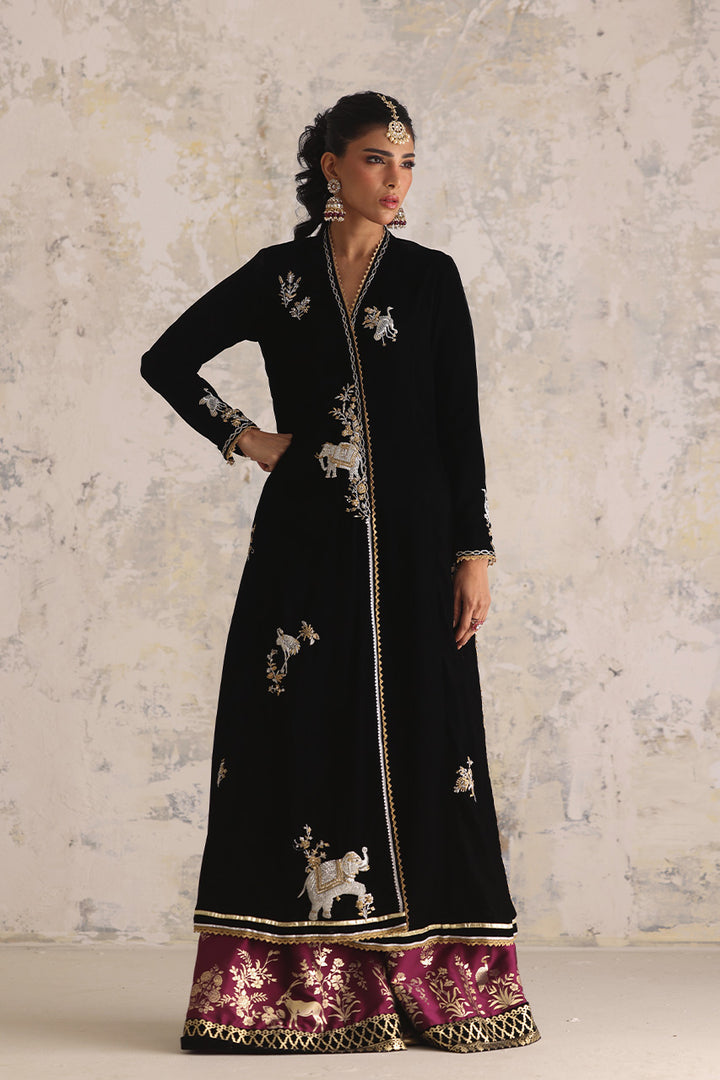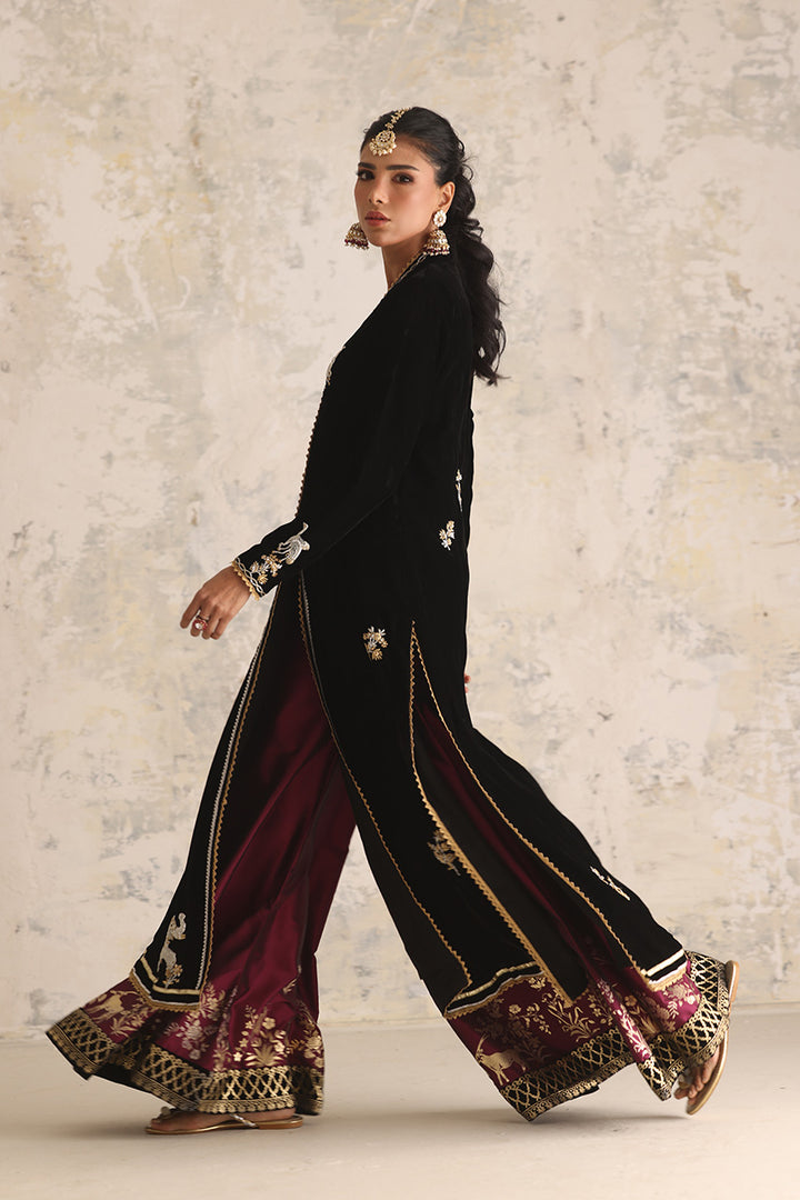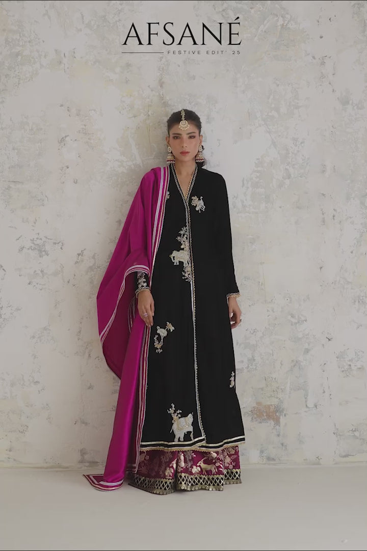 A portrait of regal artistry, this long black velvet aba draws from the grandeur of Mughal courts. Handcrafted zardozi in gold and silver trace the neckline and front seam with delicate geometries that give way to flora and fauna motifs, each glimmering softly. Differing bouquets and motifs adorn the length and sleeves, with sequins and beads enhancing their opulence, while metallic trims and gota frame the edges. Deep magenta katan silk dhaka pants introduce a vibrant counterpoint, their hem alive with gold foil-printed motifs and velvet borders. Completed with a light magenta katan silk dupatta, edged in silver and gold trims, the ensemble radiates measured richness — timeless, majestic, and meticulously composed.