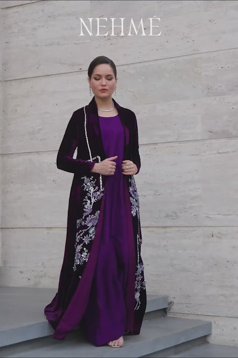 This look brings fluid architecture to life — a long, aubergine velvet jacket with a shawl collar drapes over. Across its length, floral and geometric motifs converge, meticulously handcrafted in tonal sequins, crystals, beads, and sculpted fabric tied in with silver zardozi. Paired with a plain raw silk kaftan in a lighter shade, buffering the rich artistry above. Completing the trio, a khaddi silk shella drapes lightly, its tasselled corners add subtle movement. The purple ensemble finds equilibrium in contrast — structure against softness, shimmer against stillness.