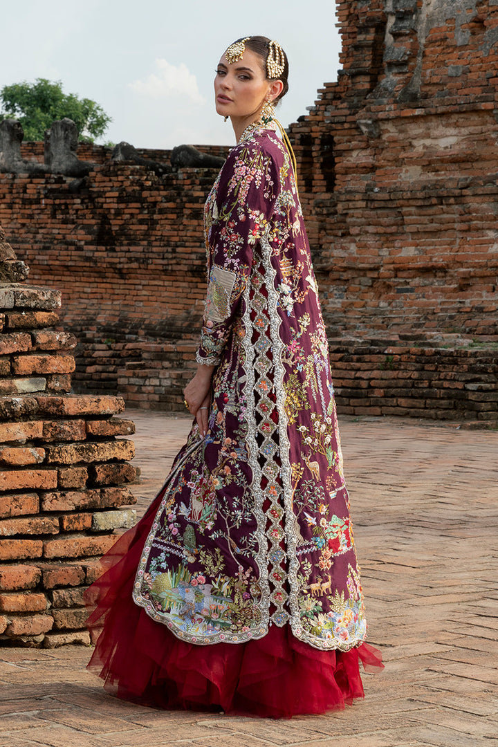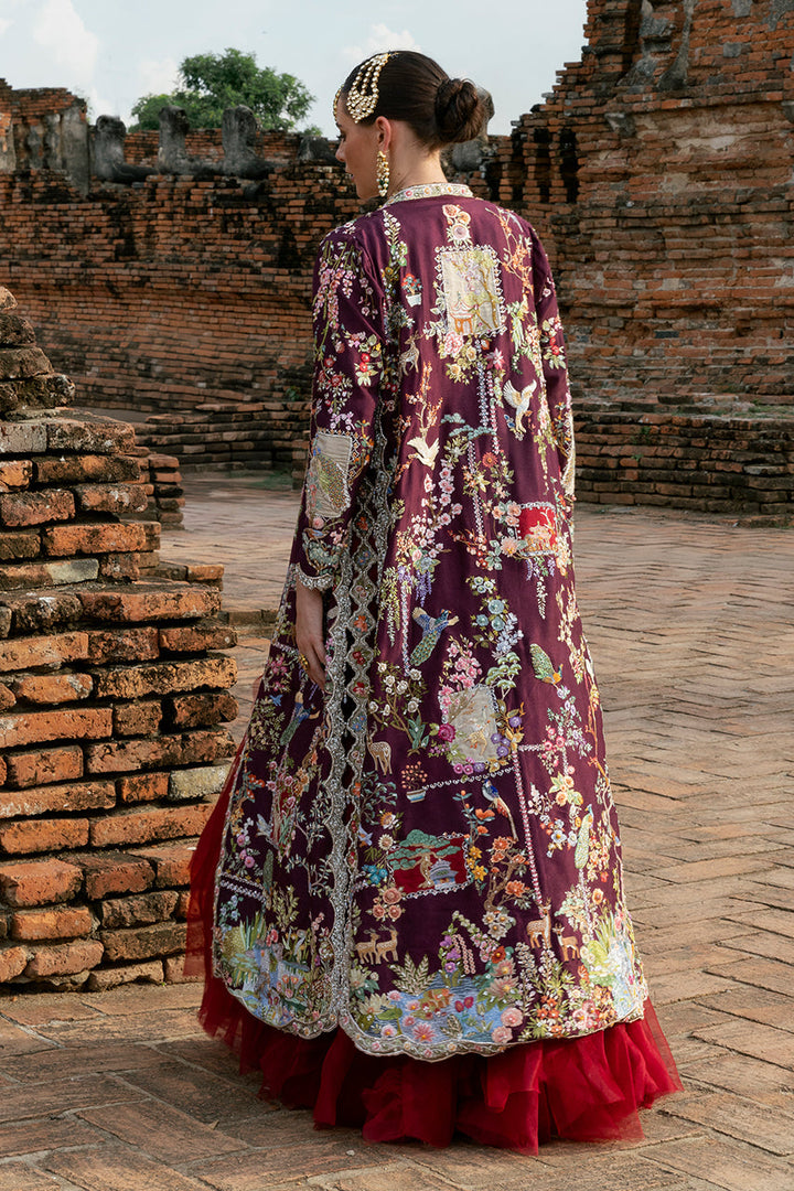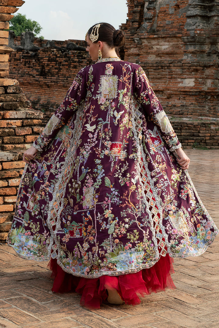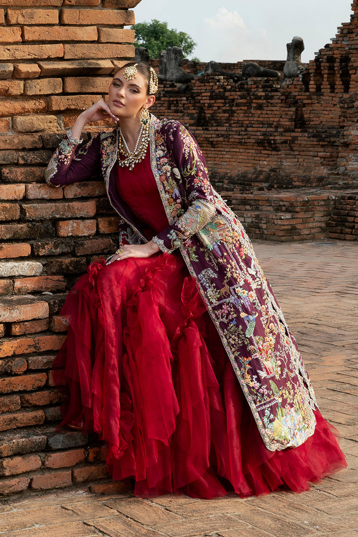 An elongated silhouette defines this look, where the jacket gracefully trails to ankle length in silk and metallic tissue. The embroidery that covers its surface vibrant florals, winding vines, and delicate fauna is finely created with aari work, heightened by crystals, beadwork, and carefully placed cutwork. Hanging tassels of crystal add gentle movement, while ornate sleeves further underscore its elegance. Worn over a red organza shift dress, the ensemble gains softness and dimension; the layered sheerness amplified against the jacket s ornamented density. The result is a balanced composition, commanding in presence yet fluid in wear. Conceived as heirloom attire, it brings together structure, craft, and romance in equal measure.