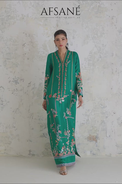 An expression of easy opulence, this light emerald kaftan captures the joy of intricate craft. The pure raw silk drapes softly, its expanse and sleeves embroidered with vibrant threads that weave between florals and geometry in gentle rhythm. Scalloped florals along the hem add movement and a playful finish — perfect for moments that ask for relaxed elegance.