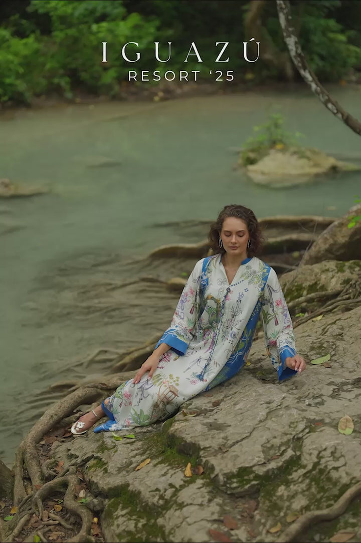 The pure silk kaftan shines with its playful printed motifs — a mix of florals, vines, and abstract forms that dance across the flowing silhouette. Handcrafted tassels along the banded neckline add texture and movement, enhancing its charm. Layered over it, the ankle-length organza jacket mirrors the same print in sheer transparency, letting the floating motifs add depth to the ensemble.