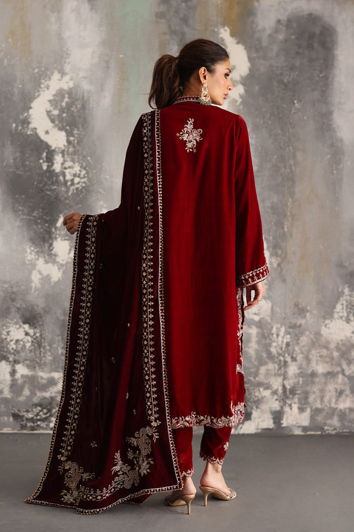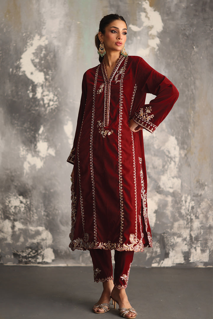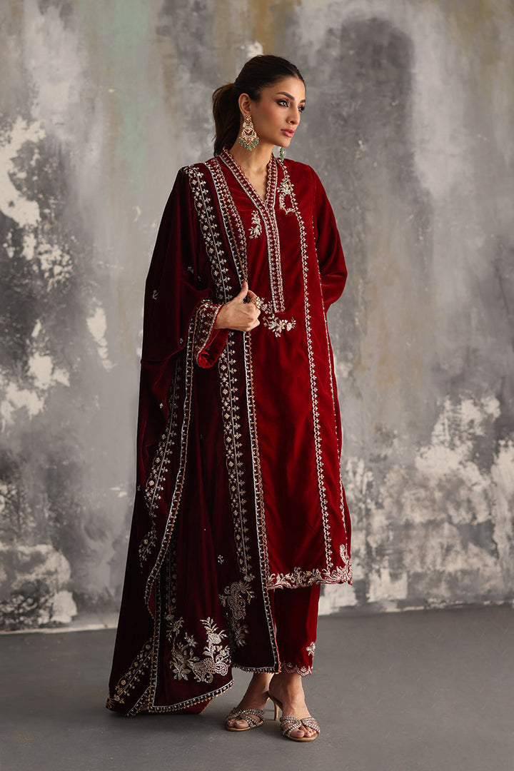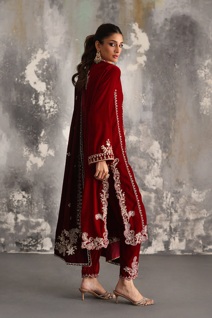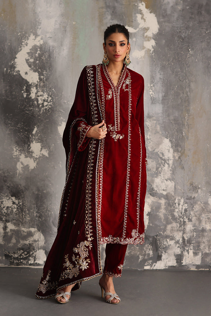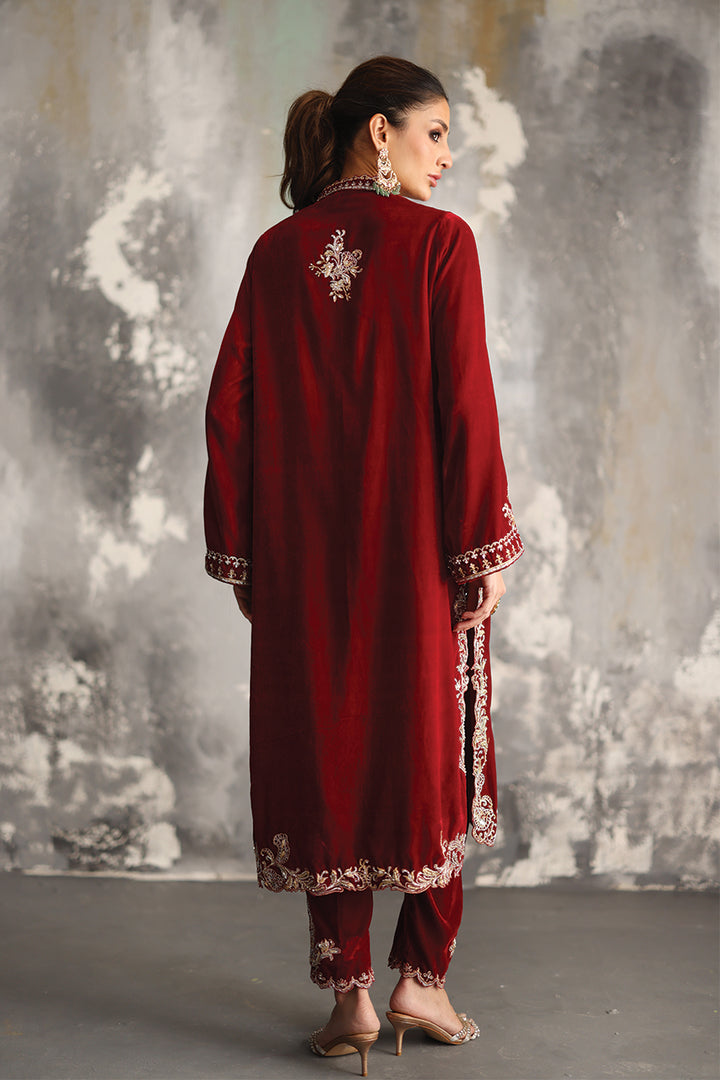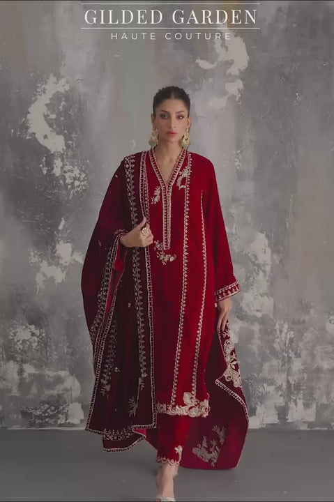 Velvet, zari, and zardozi meet in a composition of luminous depth. The red velvet kameez gleams with gold embroidery — zari embroidered patterns, etched with sequins and flourished with hand-done zardozi tendrils on the neckline, sleeves, and hem. The cutwork-edged hem heightens the textural interplay, adding graceful movement to the luminance. The straight pants carry the spirit, zari and zardozi motifs along scalloped hems. Draped in maroon velvet, the dupatta glows with gold zari borders and floral zardozi pallu corners. Each textile, thread, and cut reinforcing a tactile, layered richness.