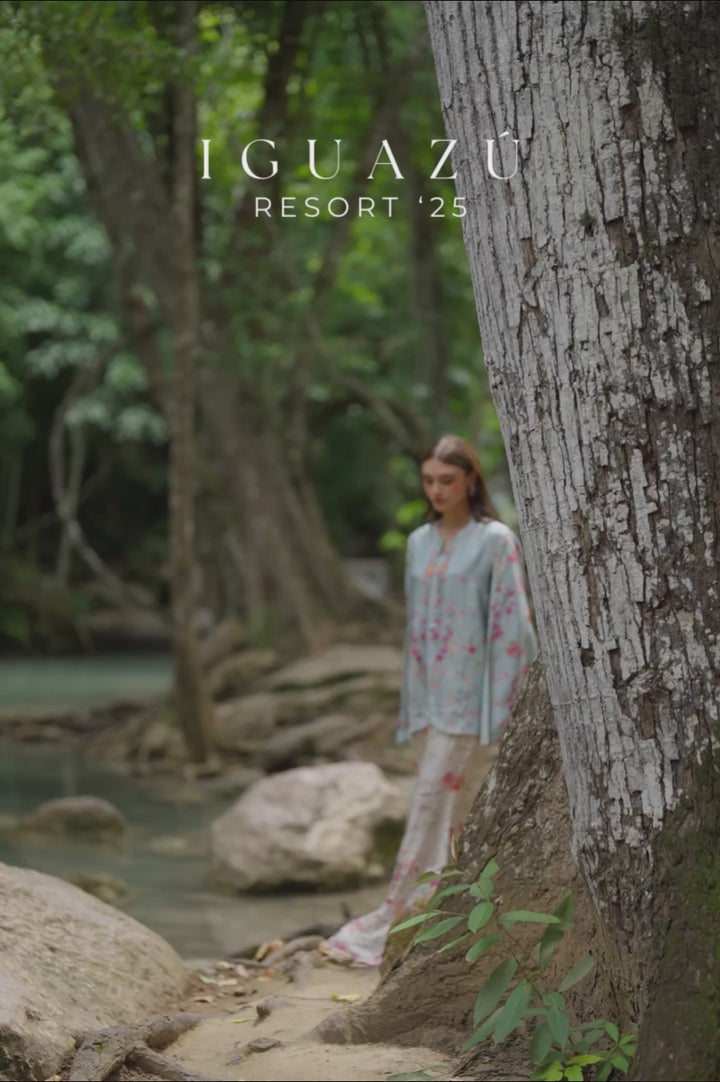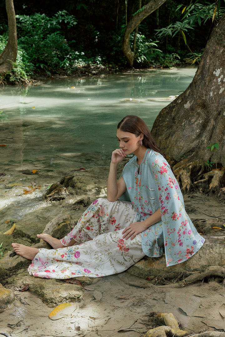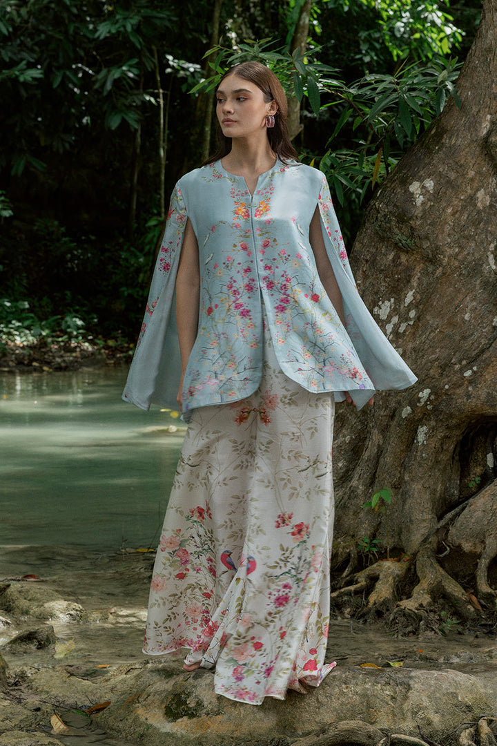 This look was designed to mesmerize in movement: a cape-style top with effortless fall, flared trousers with a romantic sweep, and a solid camisole that anchors it all. Bursts of vivid printed florals across blue and white bases hit a falsetto on the rhythmic drape of the pure silk, creating a harmony in every turn.