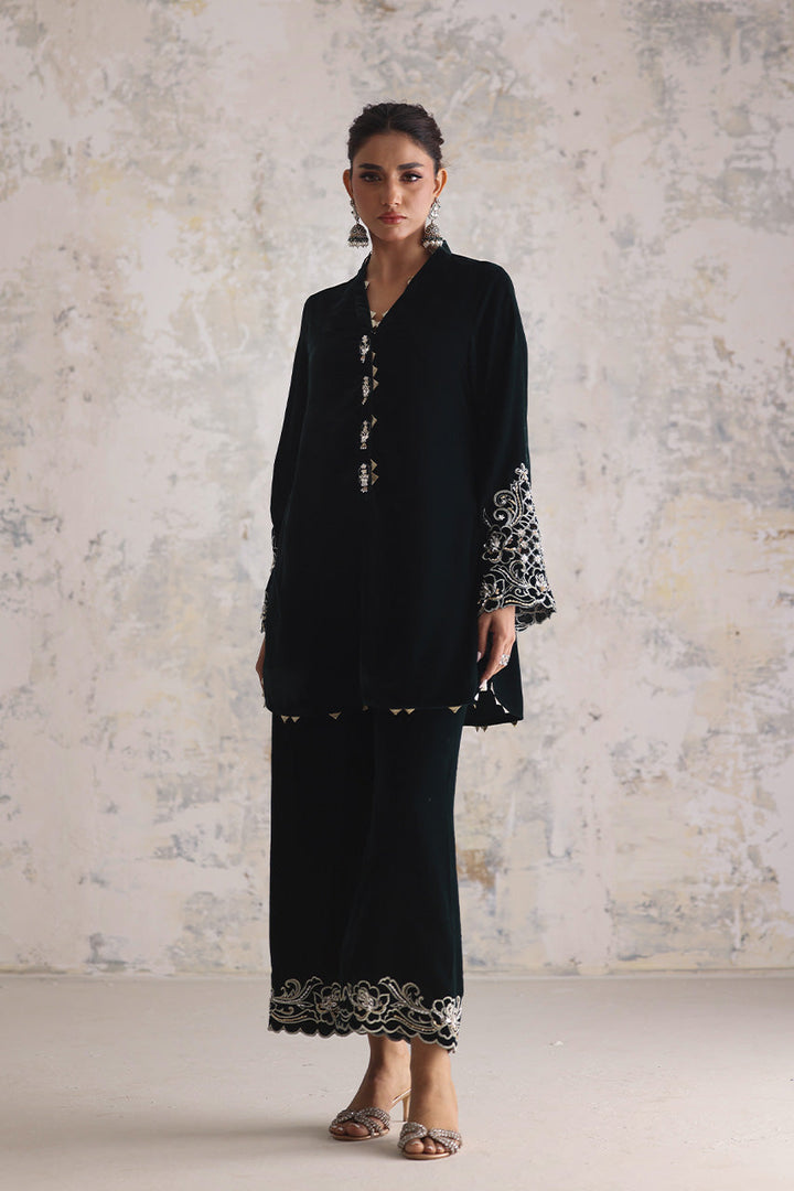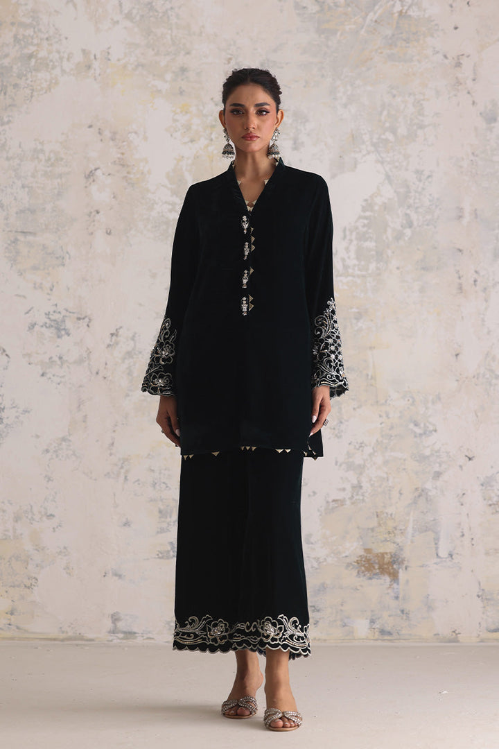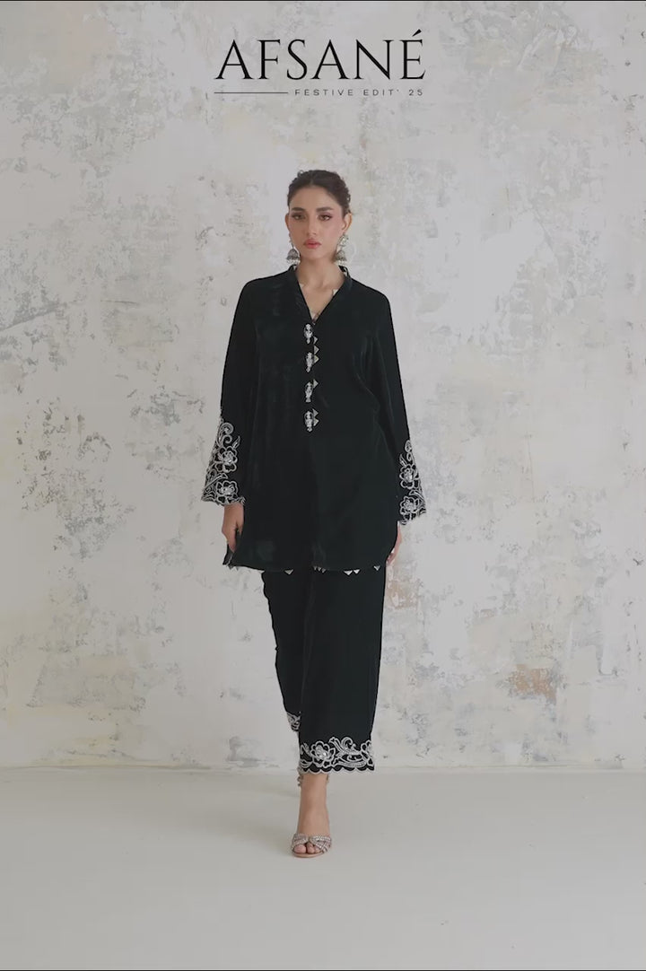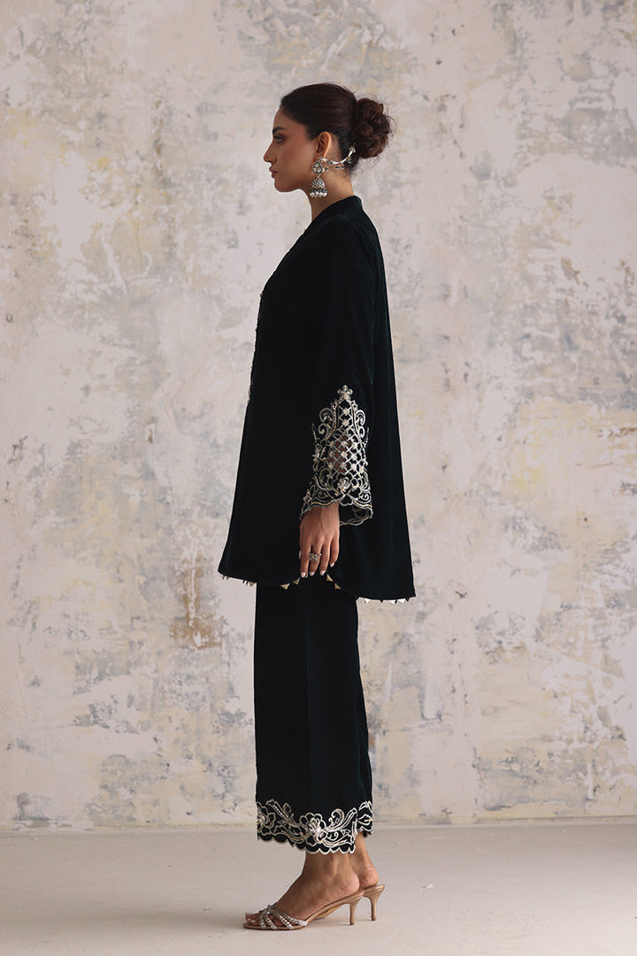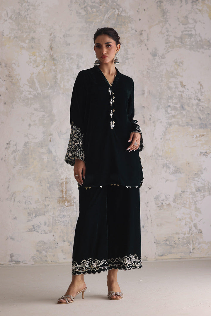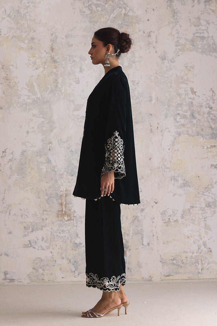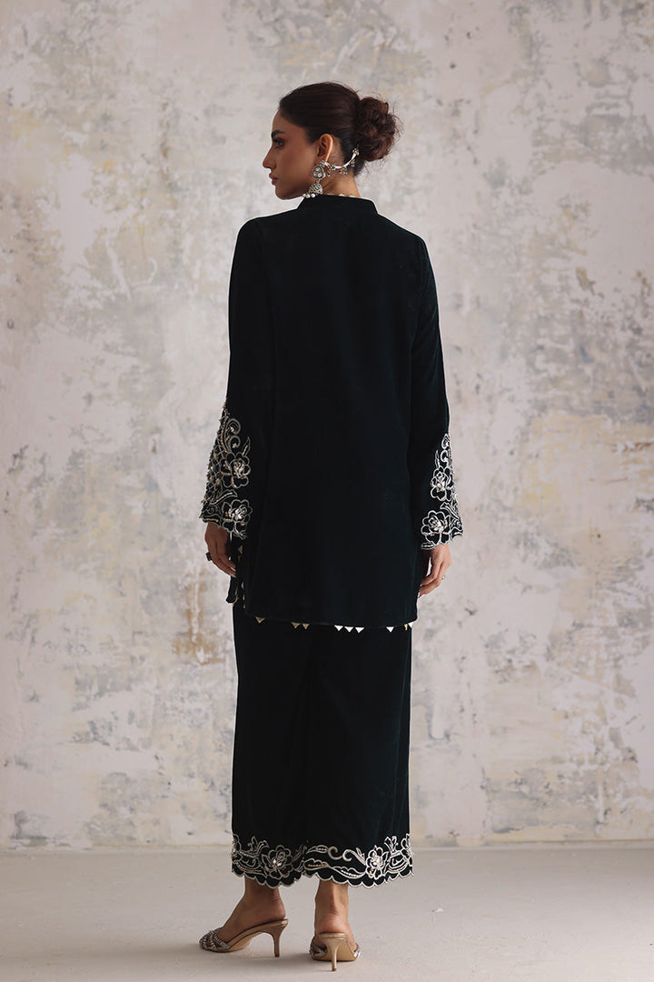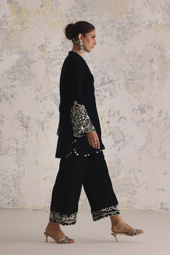 This deep green velvet set carries luminous craft. On the short kameez, white-gold threads form fine florals along the neck placket and cutwork edged sleeves. each touched with dimensional handwork that glint softly under light. Beaded details glimmer at the neckline, while gota accents trace the side seams and hem in subtle metallic rhythm. The matching velvet izaar mirrors the story — its scalloped border embroidered and hand-embellished to complement the ornate sleeves, completing the look with cohesion and quiet grandeur.