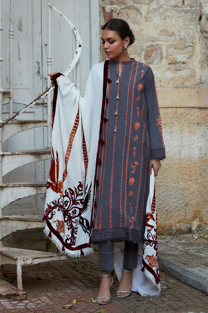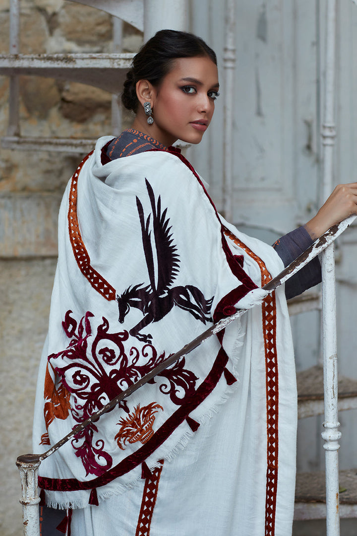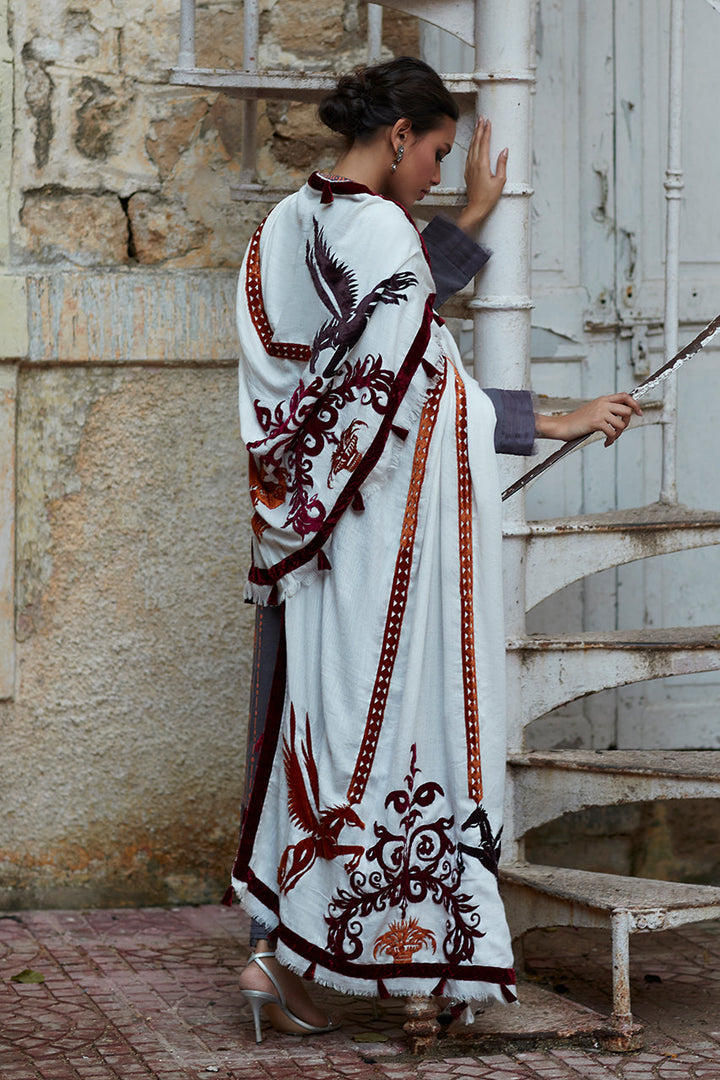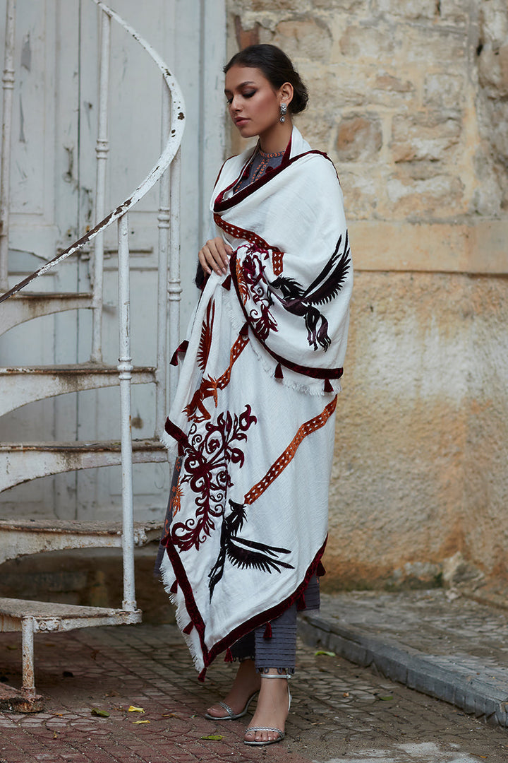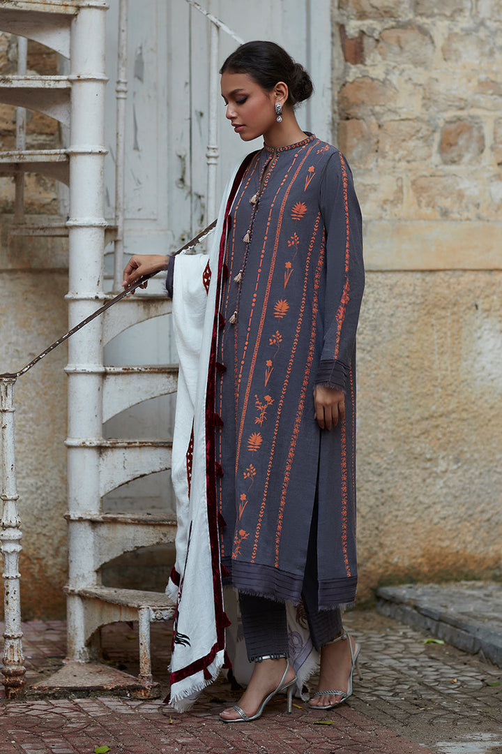 A fossil grey cotton elegant screen printed shirt inspired by botanical florals adorned with intricate handcrafted textures. This ensemble comes with matching textured pants and pure pashmia velvet cutwork shawl.