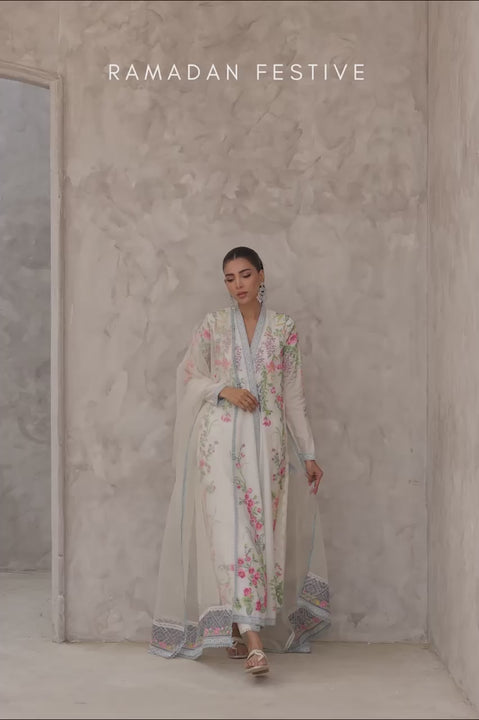 Delivery in 2-3 WeeksA vision in white that blooms quietly with pastel rhythm. The chogha, cut from white pure kora silk, is adorned with cross-stitched trails of flowery tendrils cascading down the shoulders, reaching out to meet a blooming hem. The pastel wildflower medley is framed by geometric bands that bring subtle structure to the organic rhythm. Matching straight pants anchor the look, while a white organza dupatta, edged with trims and matching blooming motifs along the pallu, drapes over it all. A charming look for evenings where softness and presence coexist.