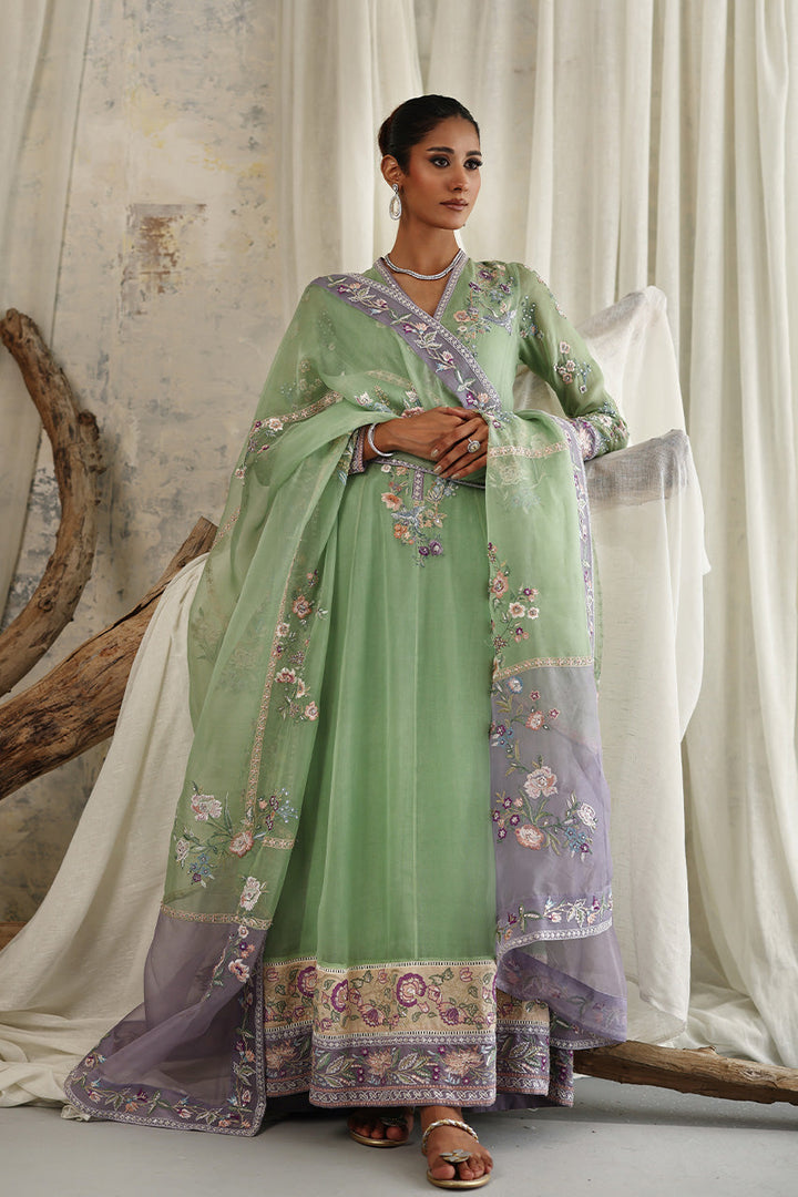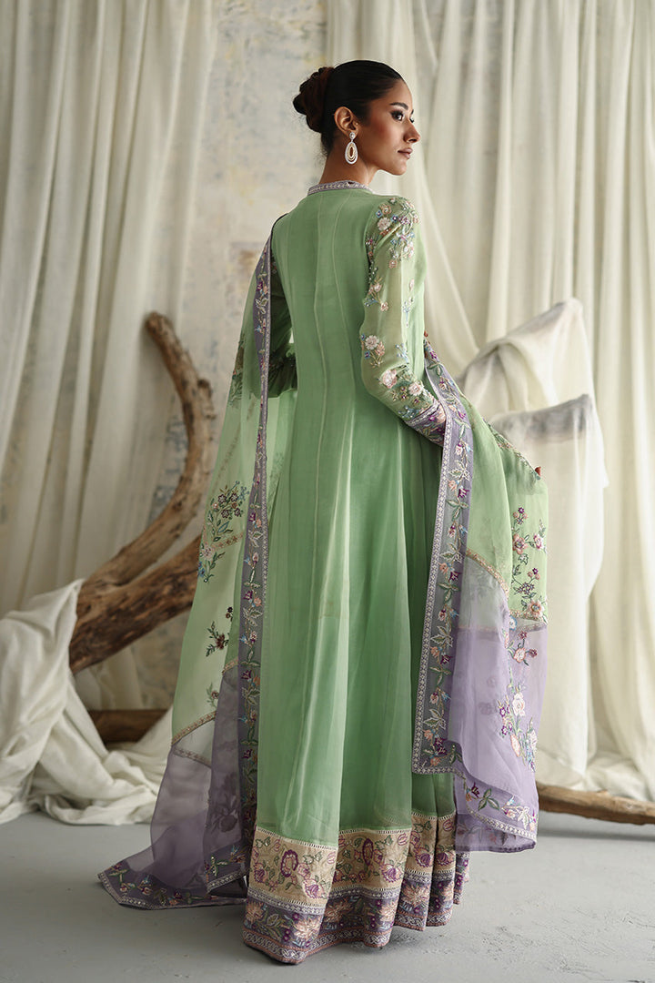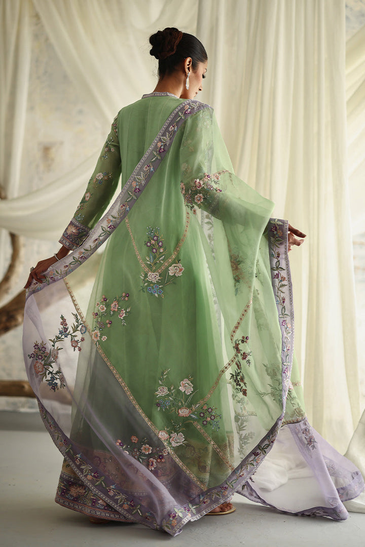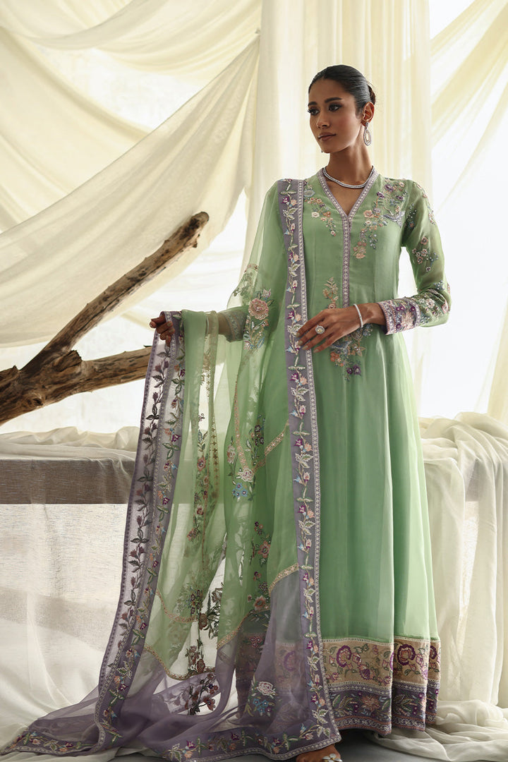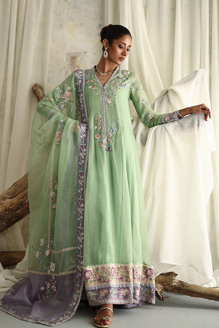 Crafted in airy organza, this green kalidaar features hand-done embroidery and embellishments along the neckline and sleeves, picking up soft tonal cues from the contrasting, embroidered lavender and beige borders at the hem. The dupatta echoes this interplay, detailed with delicate motifs and finished with matching, embroidered lavender edging. Light, layered, and quietly festive, it €™s a look that moves easily between summer lunches and elegant daytime festivities.