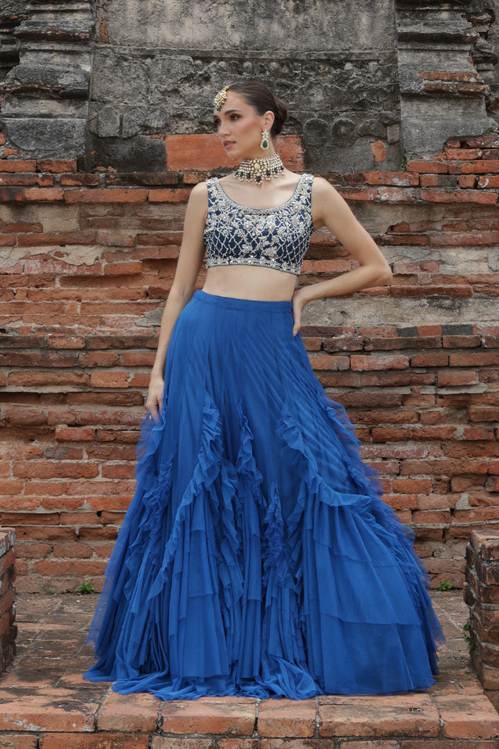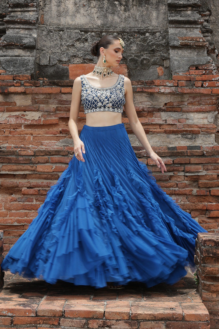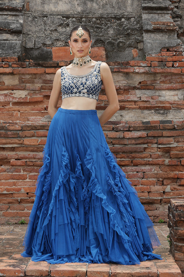 This ensemble blends strength and softness in perfect harmony. The blouse, detailed with intricate zardozi embroidery, exudes a bold, structured presence, showcasing the artistry of its craftsmanship. In contrast, the electric blue net skirt cascades effortlessly, its frilled tiers creating a gentle, fluid motion. The marriage of ornate, heavy embellishment with light, flowing fabric makes this set a statement of vivacious beauty.