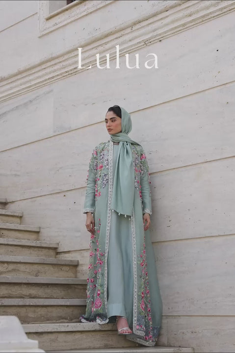 Delivery in 2-3 WeeksMint blue organza blooms in a floor-length A-line jacket, its surface animated by flowering tendrils trailing across the length and sleeves. Simple cross- stitches in shades of pink, lavender, green, and white render a spring story, layered in silver zardozi and hand-placed dimensional flourishes. An intricate geometric lattice in sparkling white and silver traces the borders, bringing the garden to a composed finish. Beneath it, a solid mint blue sheesha silk kaftan and matching khaddi silk shella hold the look steady, forming an ensemble of calm elegance.