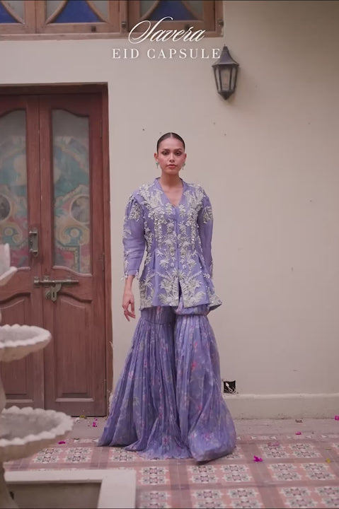 Delivery in 3 WeeksA layered ensemble that blends artisanal craft with a modern silhouette. The organza peplum jacket, in cornflower purple, is richly detailed with floral vines and delicate fauna, brought to life through screenprints layered with hand- placed sequins, beads, crystals, and silver zardozi, with tassels lining the cuffs for added charm. The matching khaddi silk camisole keeps the look grounded and minimal. Paired with a voile gharara printed with soft, watercolor florals throughout, the ensemble feels fluid and expressive — balanced between elegance and playfulness.