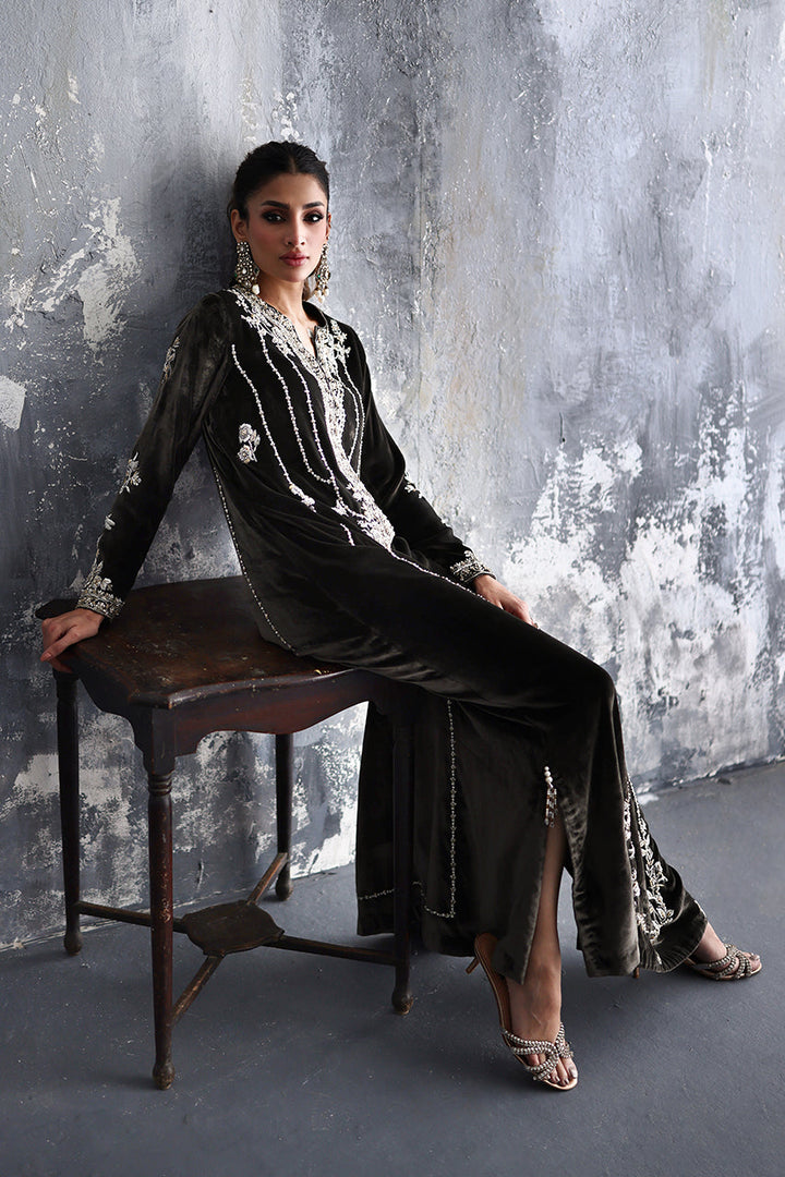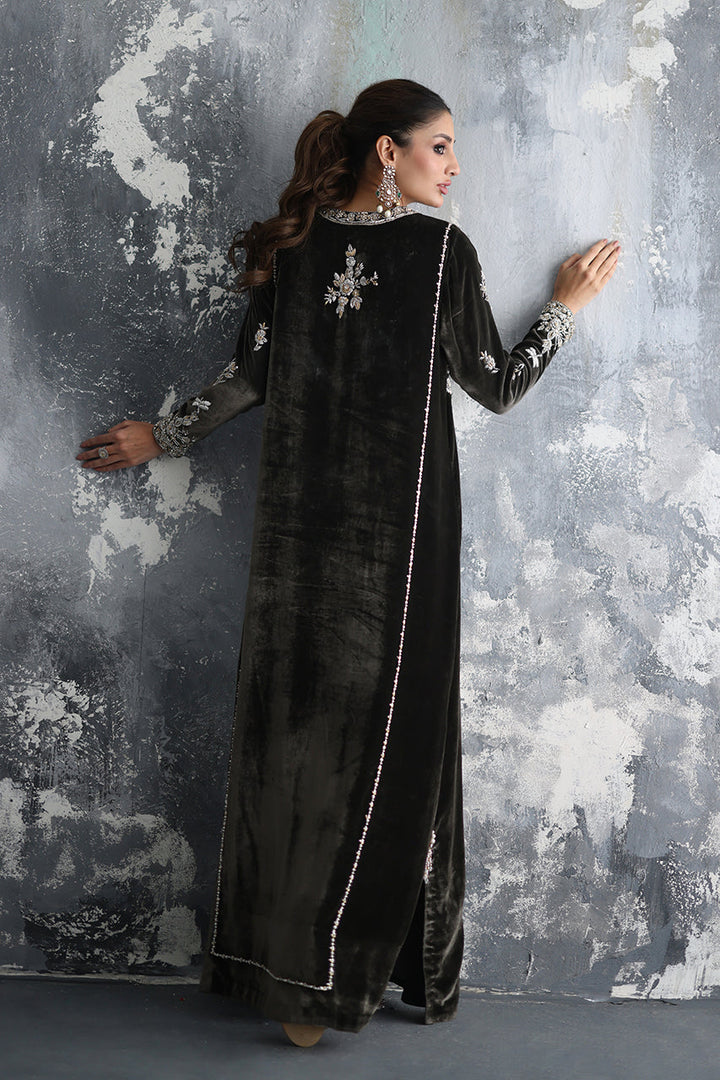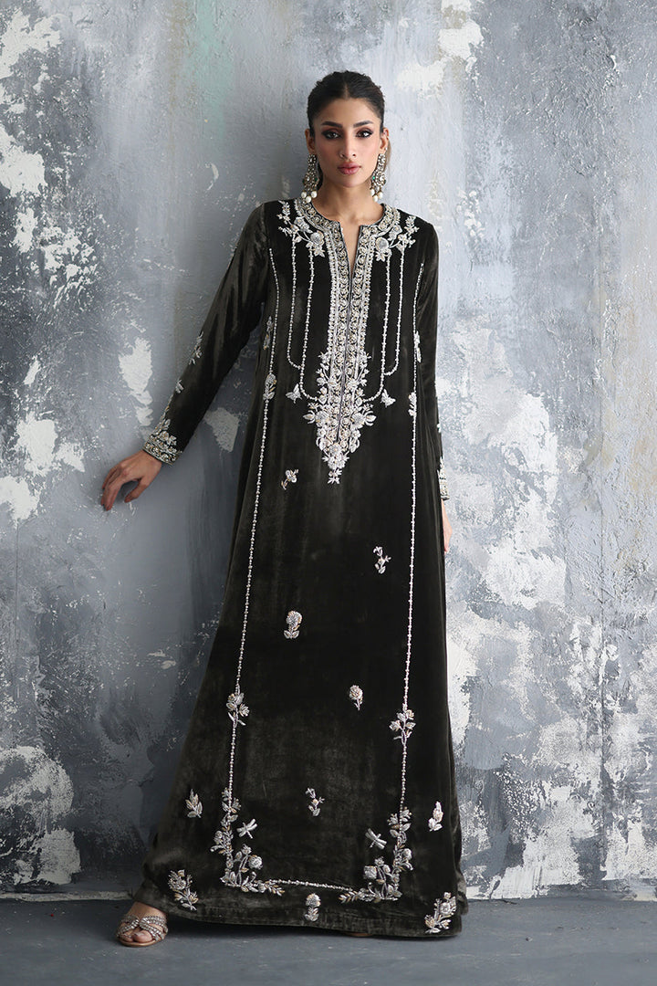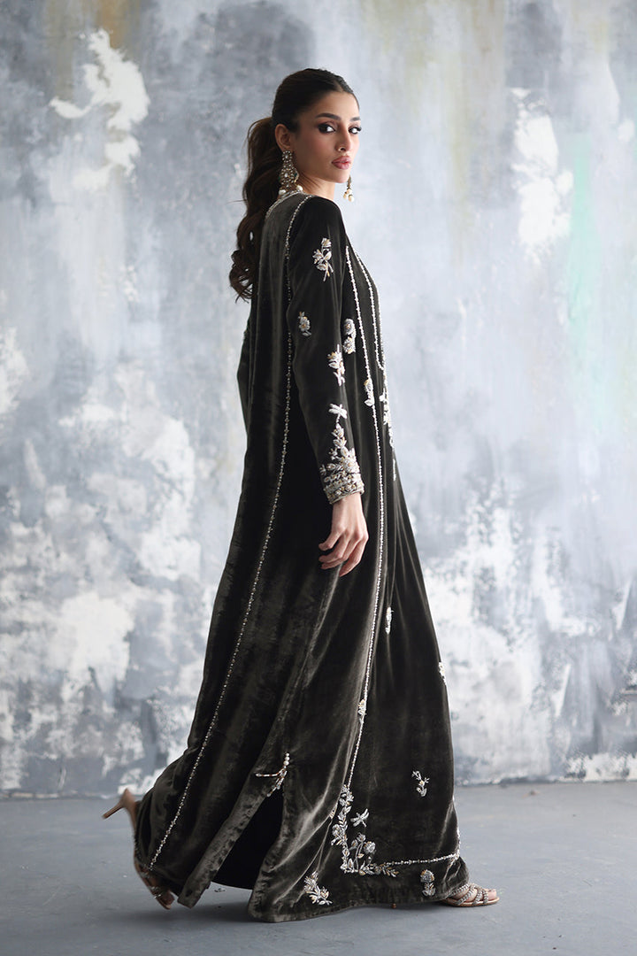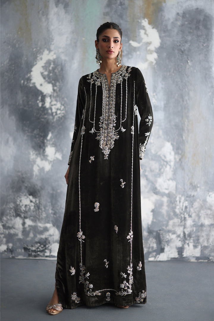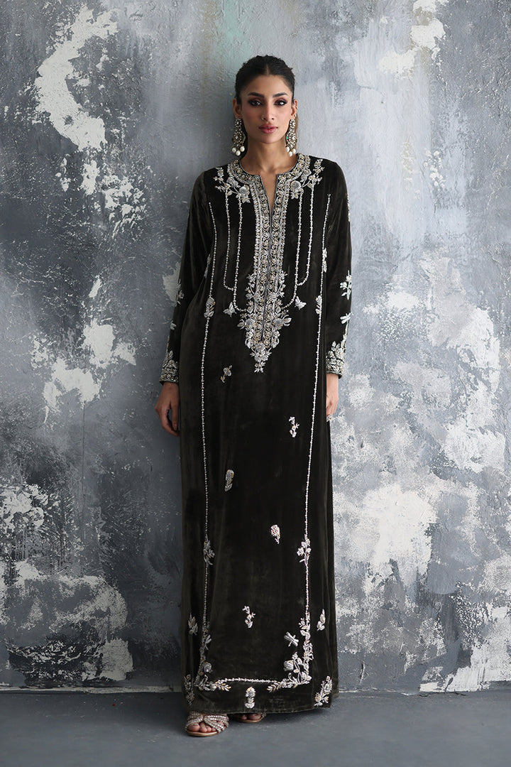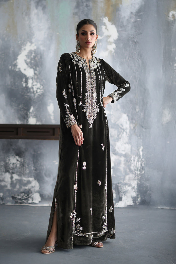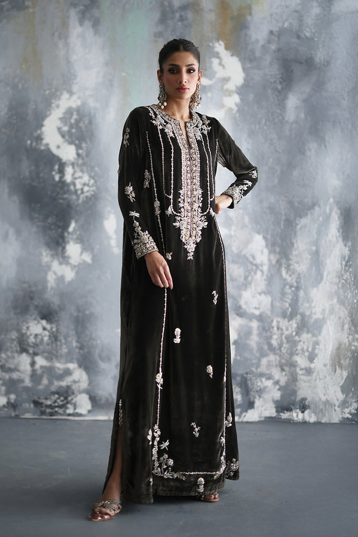 A deep grey velvet vision, hand-embellished with rich zardozi, sequins, and beadwork. Silver and gold form dense florals framed by fine geometries around the kaftan’s neckline and cuffs. Smaller bouquets continue along the length and sleeves, leading to a hem bordered with geometric lines cornered by blooms. Handmade, glittering tassels flourish the side slits, lending movement to the drape. A study in craft and sheen — where every metallic glint is rendered by hand.