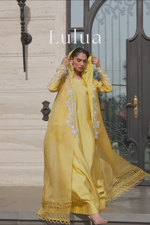 A look infused with sunlight and something special. The flared yellow organza jacket carries hand-embellished florals along the neckline and sleeves, layering sequins, beads, and crystals that catch the light subtly. Along the hem, lattice-like fabric details add texture and movement. Beneath, a flared khaddi silk kaftan and matching shella provide a solid, flowing foundation, letting the jacket’s craftsmanship take center stage.