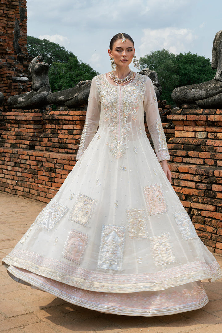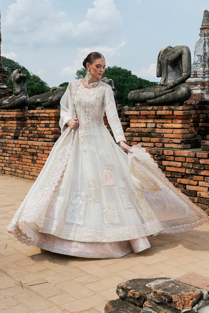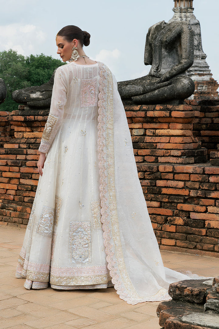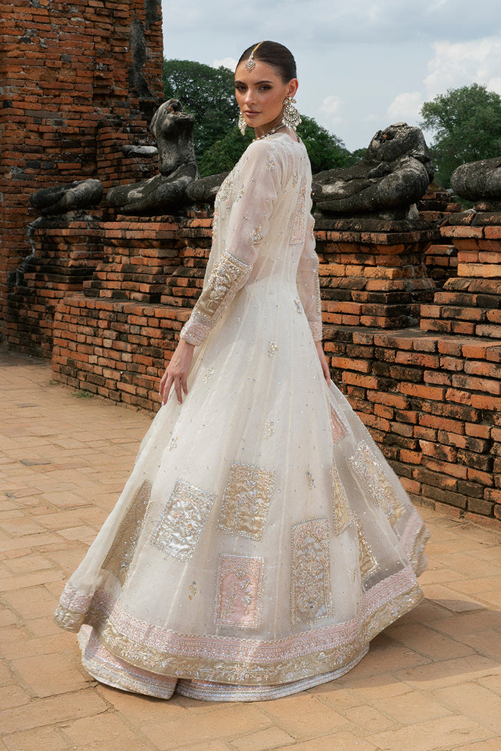 The palette of this look is luminous and restrained, built around ivory organza warmed with accents of blush, pink, and metallic gleam. On the kalidar, painterly florals in resham embroidery glow softly against the sheer base, while sequins and zardozi in gold and silver add dimension. Appliqués in gold and silver tissue with hints of pink silk enliven the hem and sleeves with tonal depth. The lehnga extends this vocabulary, hemmed with scalloped appliqué panels in tissue and pink, flowing with lightness and movement. The dupatta frames the look in scalloped pink silk borders, softly luminous with zardozi and sequins, while hand- done motifs shimmer across its body. Together, the palette creates a look of serenity and celebration, making it feel fresh yet timelessly bridal.