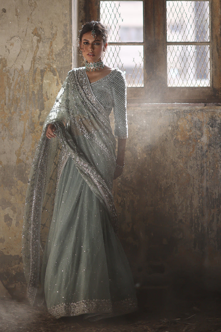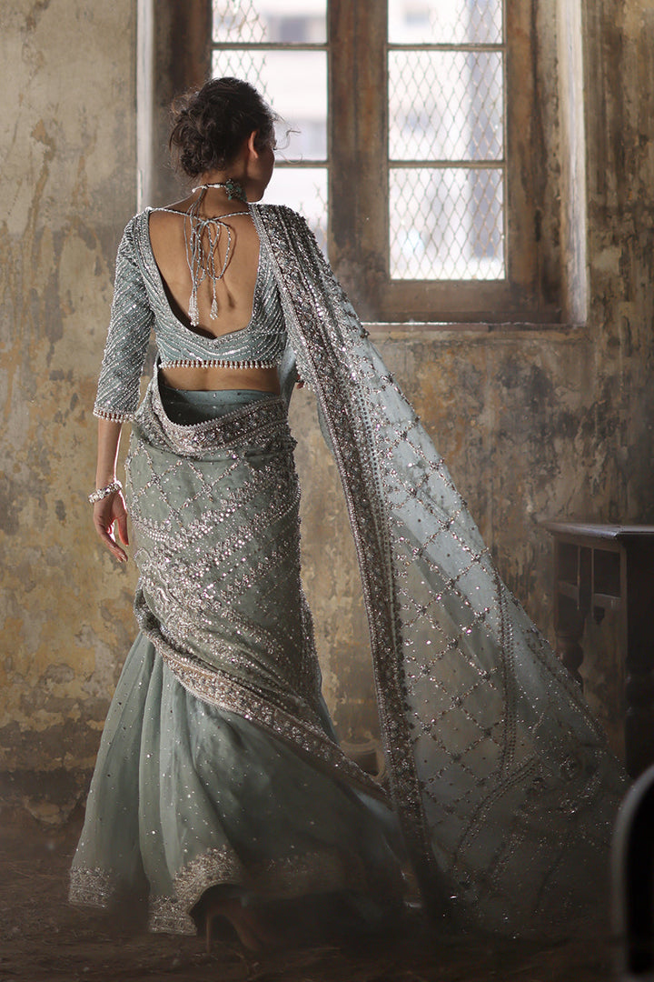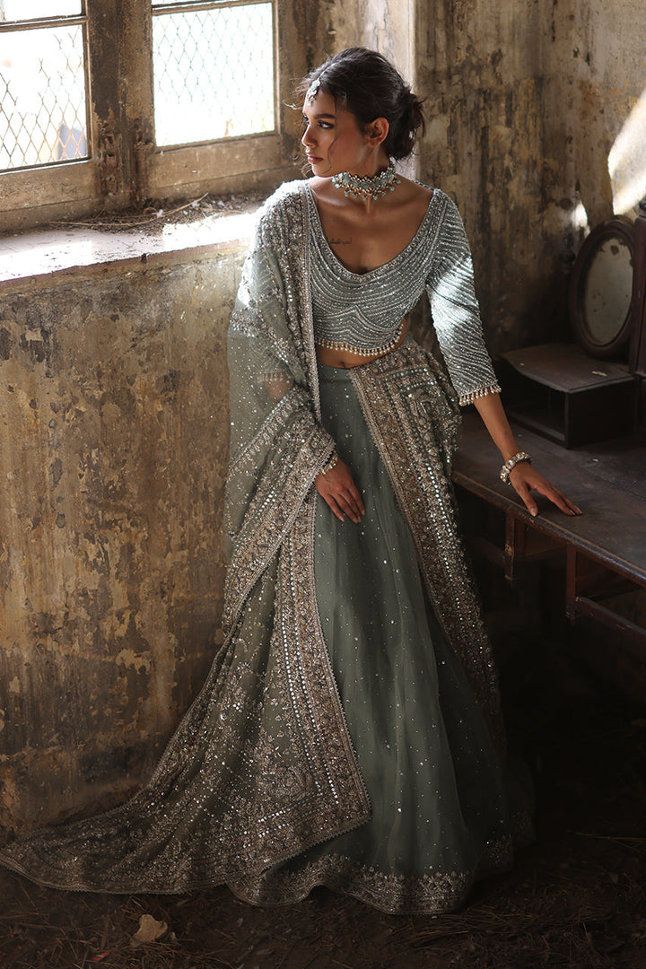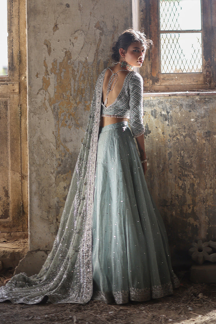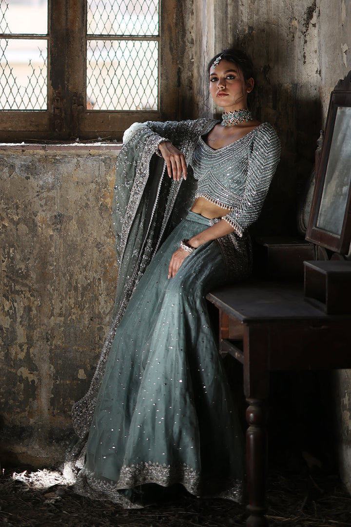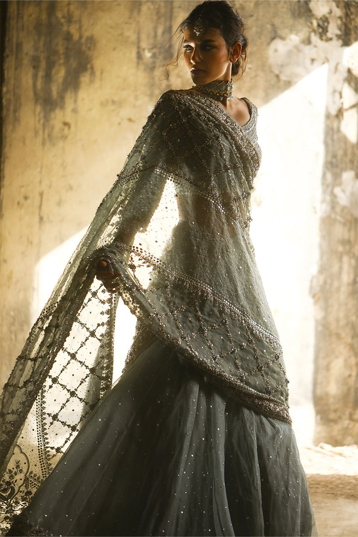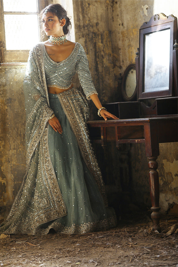 Experience pure luxury on your big day with our breath-taking bridal ensemble in an exquisite shade of old blue. Complete with a blouse, lengha, and dupatta combination, the ensemble features intricate silver zardozi work, 3D flowers, pearls, and gota work for a truly one-of-a-kind look. Don't settle for anything less - make a statement that will be remembered for years to come.