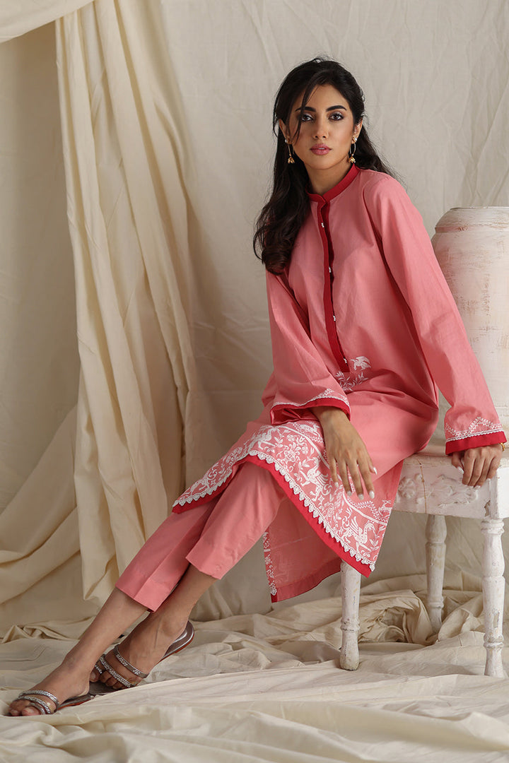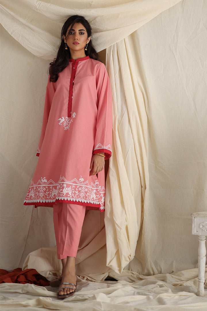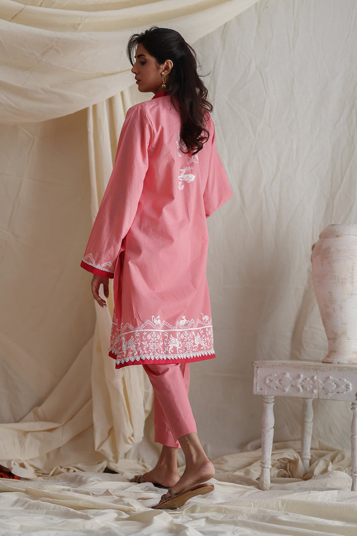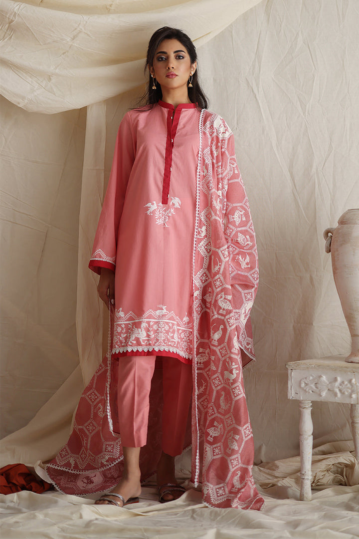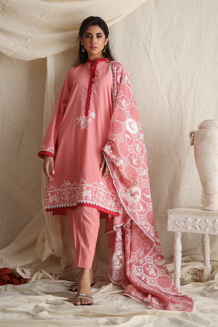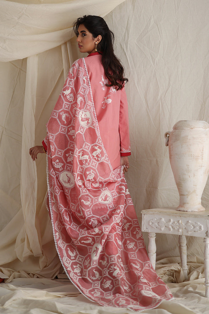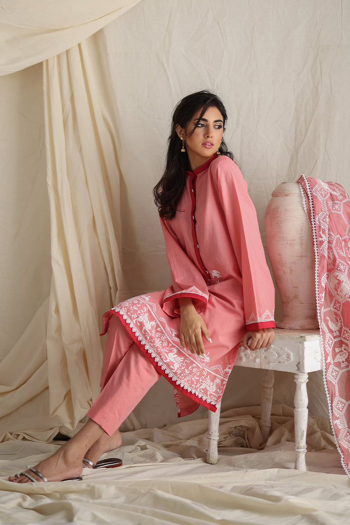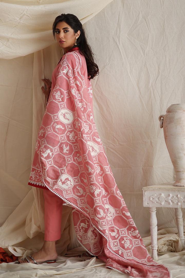 Make a statement with our beautiful melon cotton screen printed shirt, expertly crafted with delicate lace detailing. Paired with comfortable straight pants and a stunning cotton net screen printed dupatta, this ensemble is the epitome of elegance and sophistication.