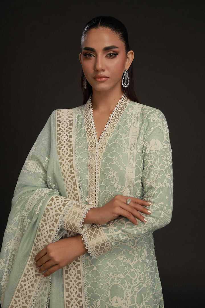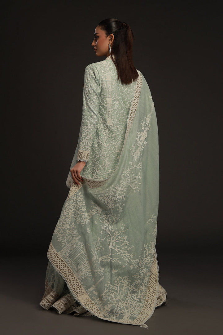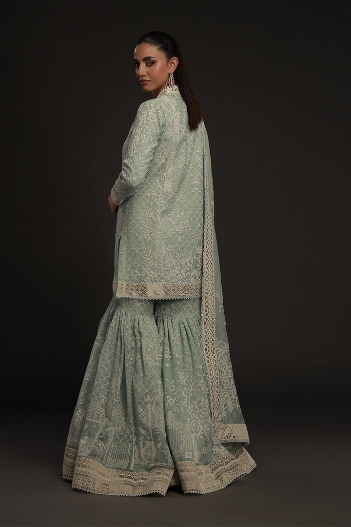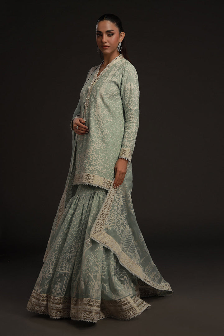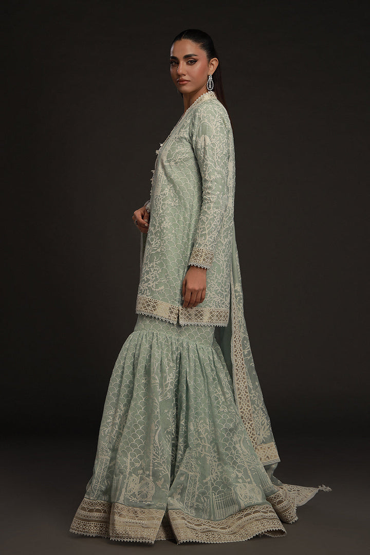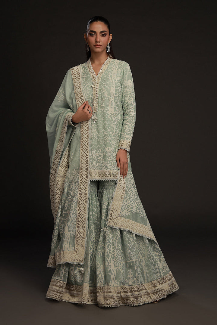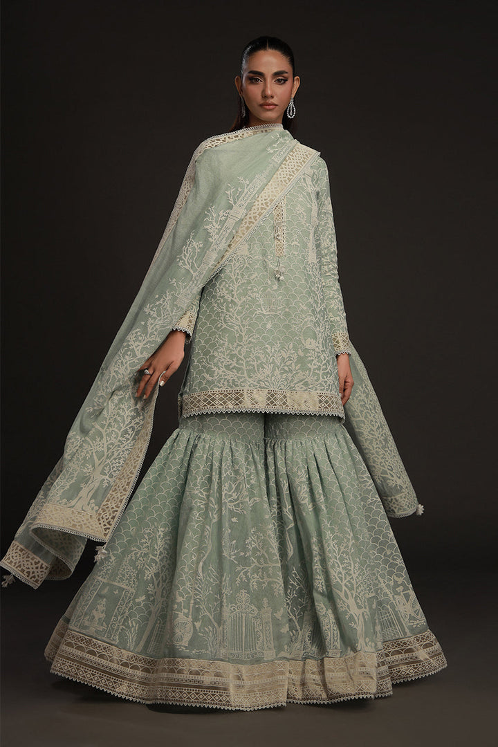 Like stepping into an enchanted garden at dawn, this three-piece look feels lush yet light. The short mint cotton net shirt is drenched in dainty white screen prints — delicate vines, florals, and garden motifs that tell a story across its surface. Gold tissue borders frame the sleeves, hem, and neckline, while handdone accents add a quiet dimension. The voluminous gharara continues the screen-print, its wide hems finished with tissue borders that glint softly. The dupatta offers pause, its pallus screen-printed to echo the set and edged in gold tissue to tie it all together.