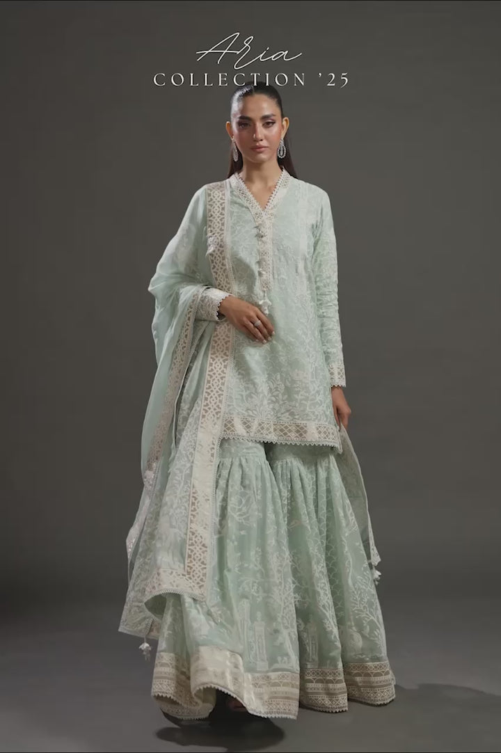 Like stepping into an enchanted garden at dawn, this three-piece look feels lush yet light. The short mint cotton net shirt is drenched in dainty white screen prints delicate vines, florals, and garden motifs that tell a story across its surface. Gold tissue borders frame the sleeves, hem, and neckline, while handdone accents add a quiet dimension. The voluminous gharara continues the screen-print, its wide hems finished with tissue borders that glint softly. The dupatta offers pause, its pallus screen-printed to echo the set and edged in gold tissue to tie it all together.