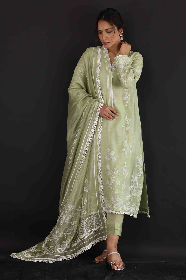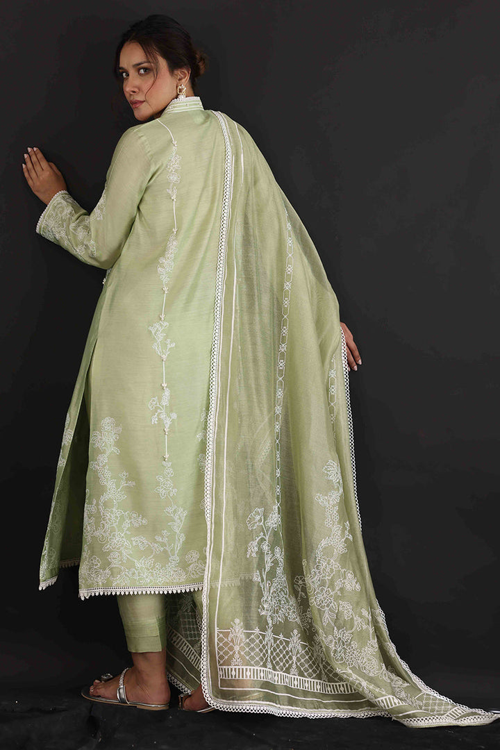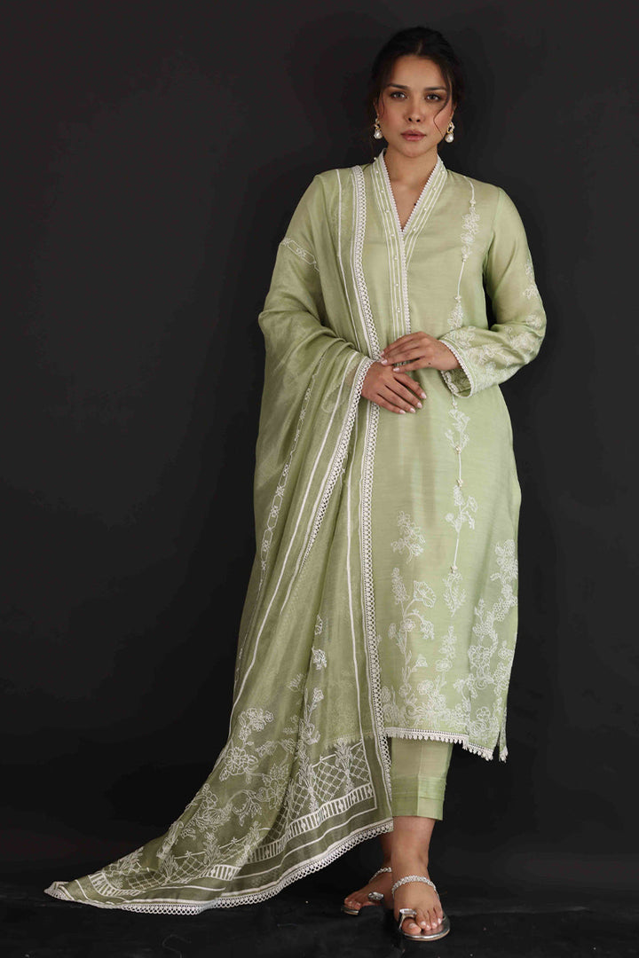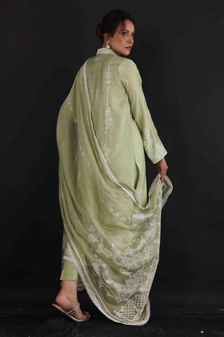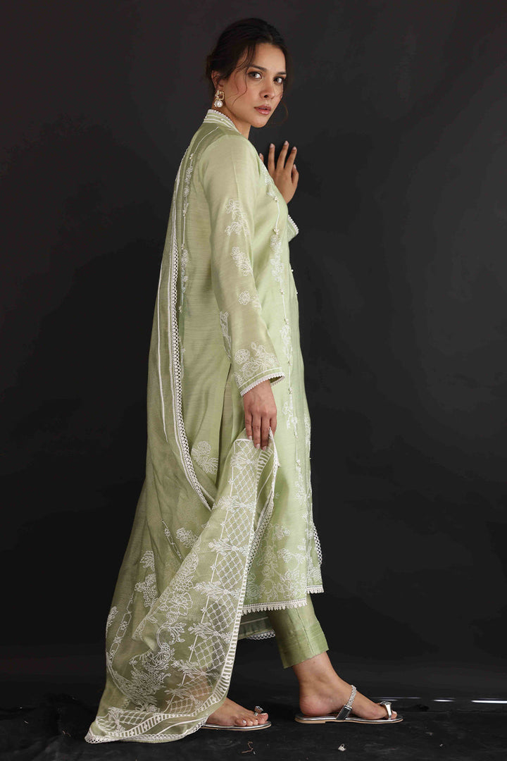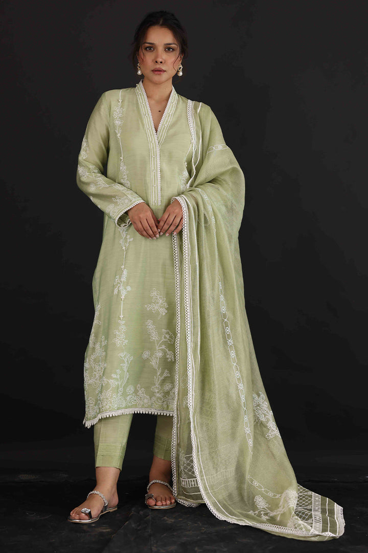 Make a pretty statement this season in this mint green hand-woven khadi silk, A-line shirt with matching textured pants, elegantly designed with laces and 3D flowers with a cotton net screen-printed dupattah.