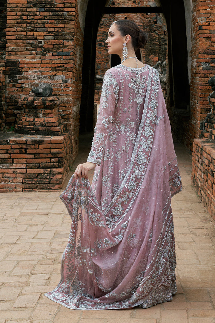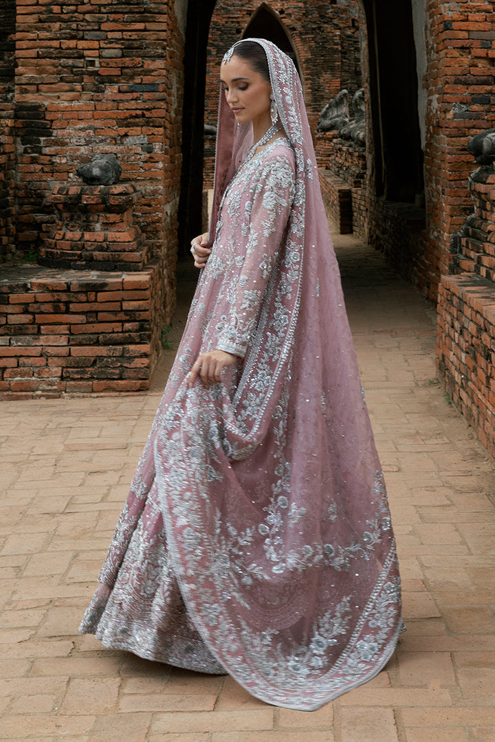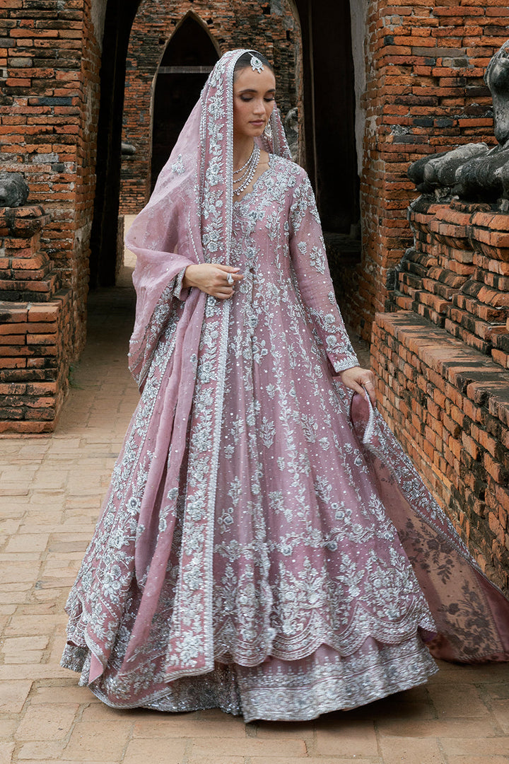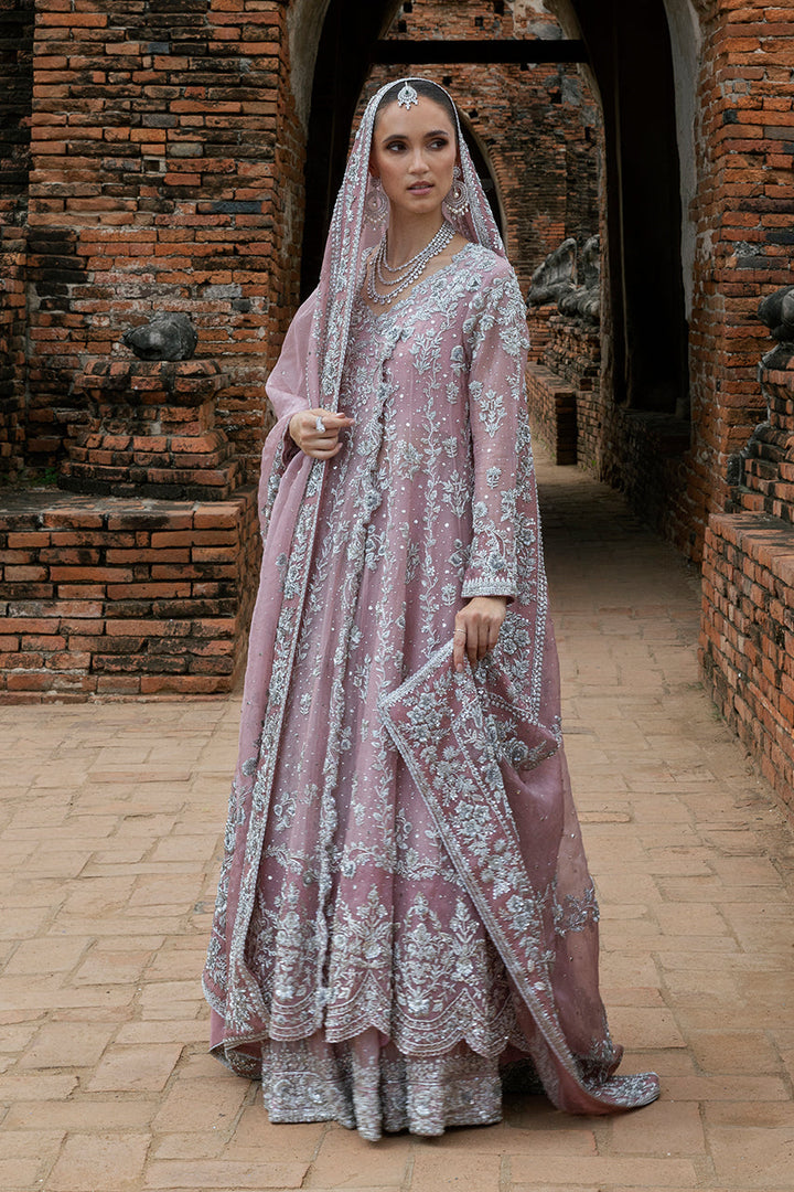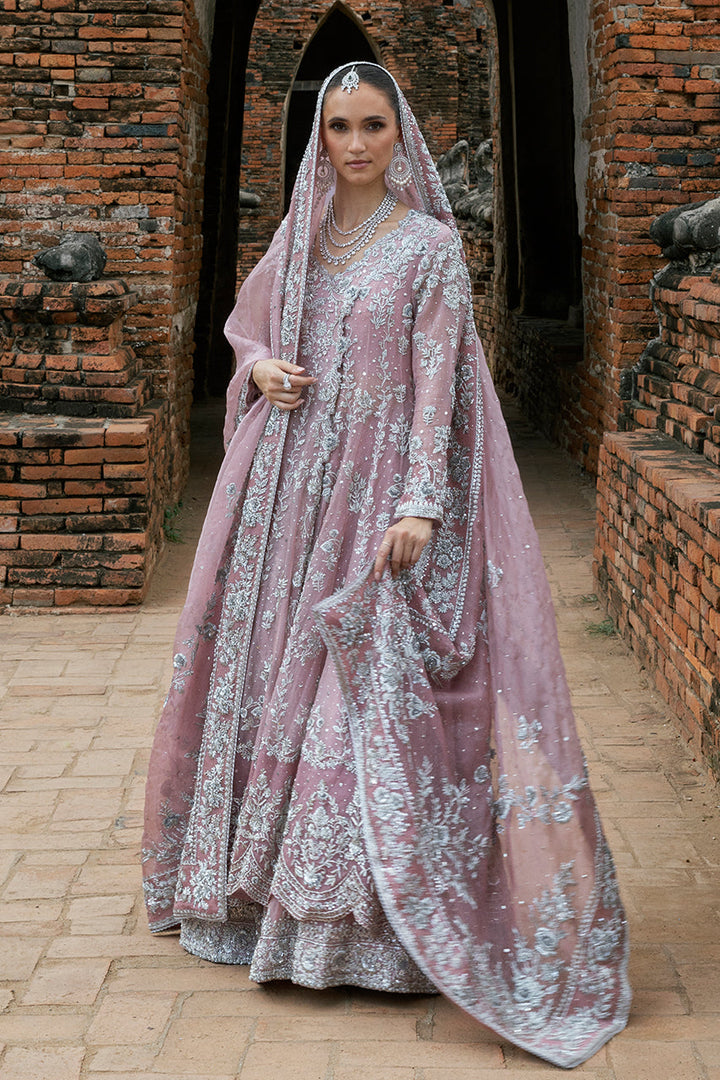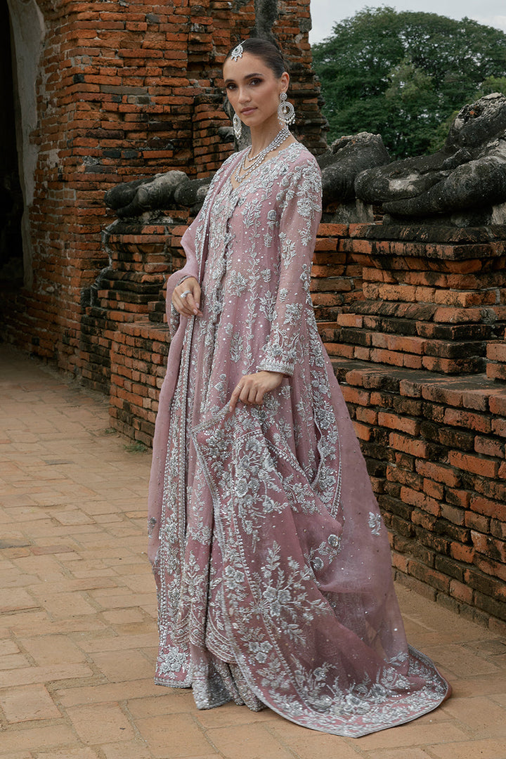 Designed to captivate in movement, this bridal set is defined by its fluid angarkha cut and layered details. The pink organza flows effortlessly, while the wide scalloped hem frames each step with elegance. Intricate silver zardozi embroidery lends texture and depth, the florals trailing across sleeves, borders, and length in a balanced rhythm. The lehnga beneath adds volume to the silhouette, its richly embroidered hem kissed with kamdani for a soft shimmer. Completing the silhouette is a dupatta of striking proportion: ornate zardozi motifs anchoring the corners, borders glistening with handwork, and a scattering of kamdani lending a celestial quality. A look that balances grandeur with graceful ease.