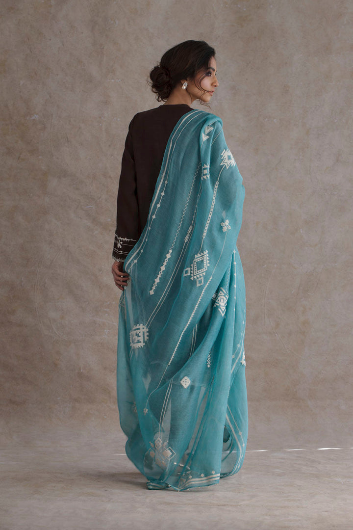 Karandi Kurta in dark brown with fun screen printed geometrics and a hint of pearl detailing. Paired with a cool ferozi blue cotton net printed dupatta. Perfect for adding a splash of colour to your winter wardrobe.