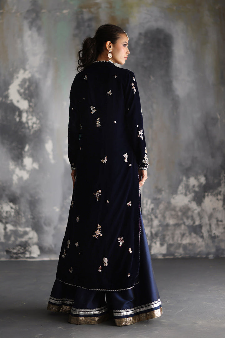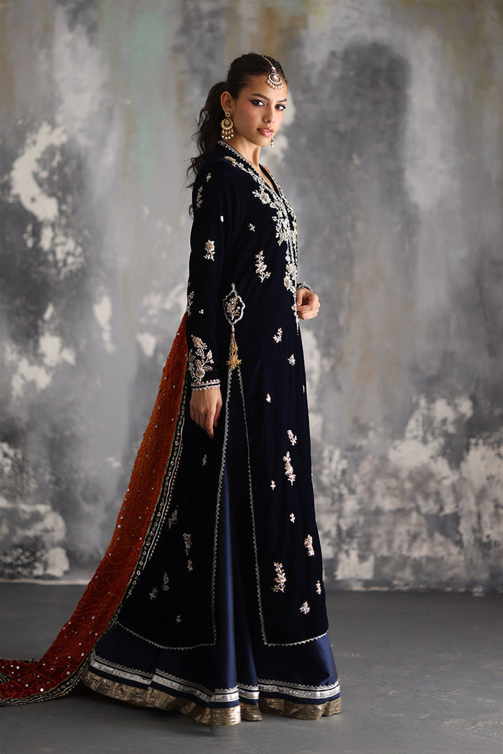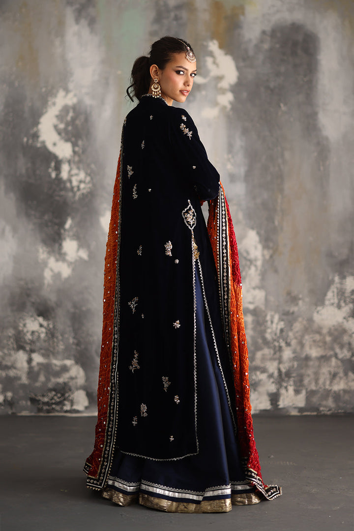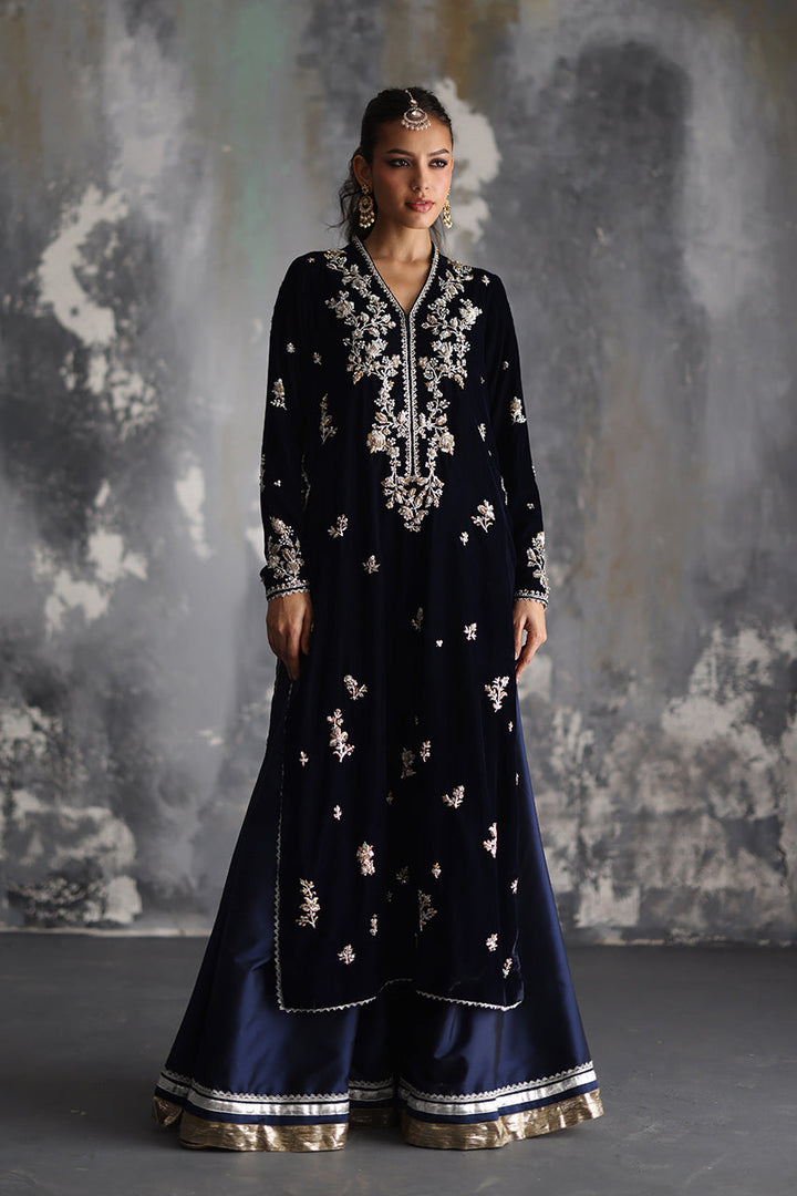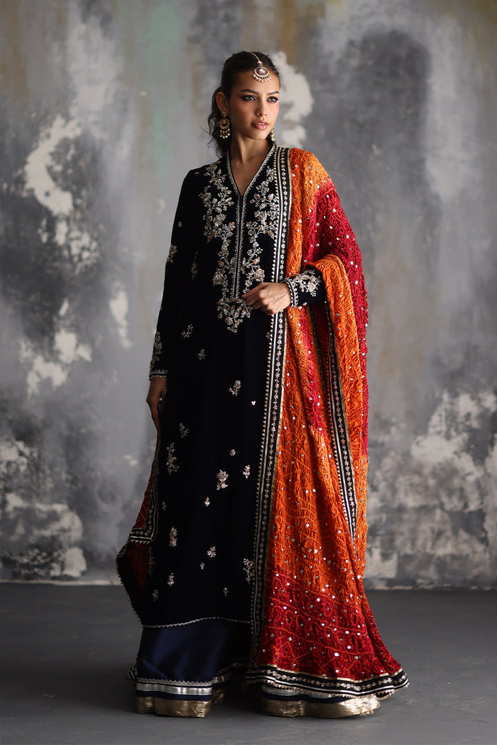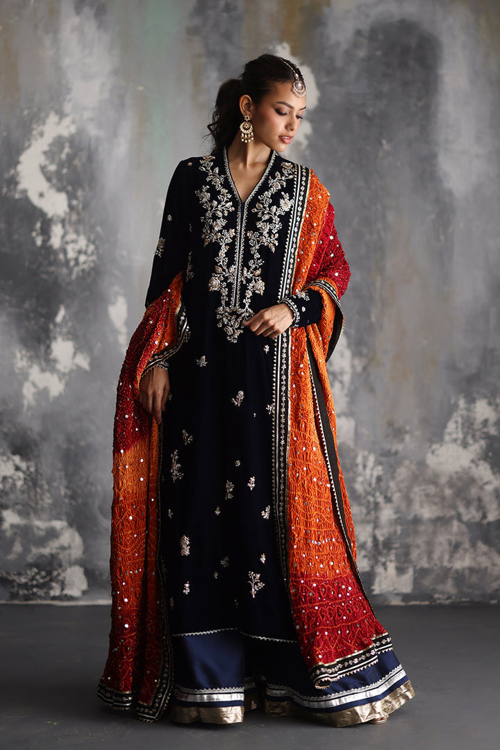 A dialogue of textures defines this ensemble — velvet, silk, and chundri connected together through glimmering handiwork. The neckline on the navy velvet kameez gleams with gold and silver zardozi tendrils, sequined and beaded for subtle brilliance. Its sleeves and length flourished with smaller flowers. Beneath it, lustre of katan silk and shimmering gota trims bring life to the dhaka pants. Completing the composition, a chundri dupatta in red and orange glows under light — its sequined surface framed with zardozi embroidered blue silk borders and gota trims. A tactile harmony of depth, sheen, and shimmer.