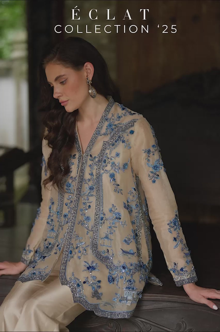 This look finds beauty in the meeting of textures. The organza jacket, airy yet commanding, is embroidered in shades of blue, with blossoms and motifs traced across its surface with painterly intent. Beads, sequins, and silver zardozi shimmer within the detailing, while three-dimensional blossoms give the jacket a sculpted tactility. A scalloped hem completes the rhythm of craft. Underneath, a solid camisole in khaddi silk provides smooth contrast, its simplicity key to the layering. The pure raw silk pants flare softly at the knee, their bootcut lines sharpening the silhouette. Tactility of the details, elevates this look into something truly special.