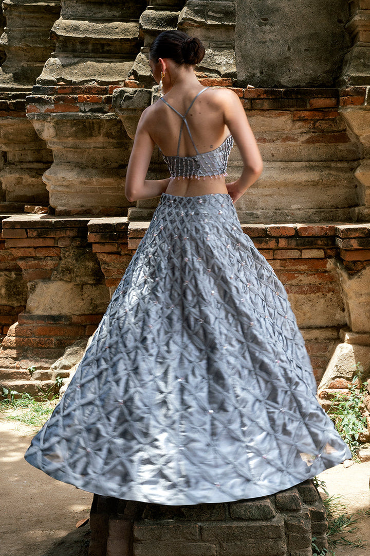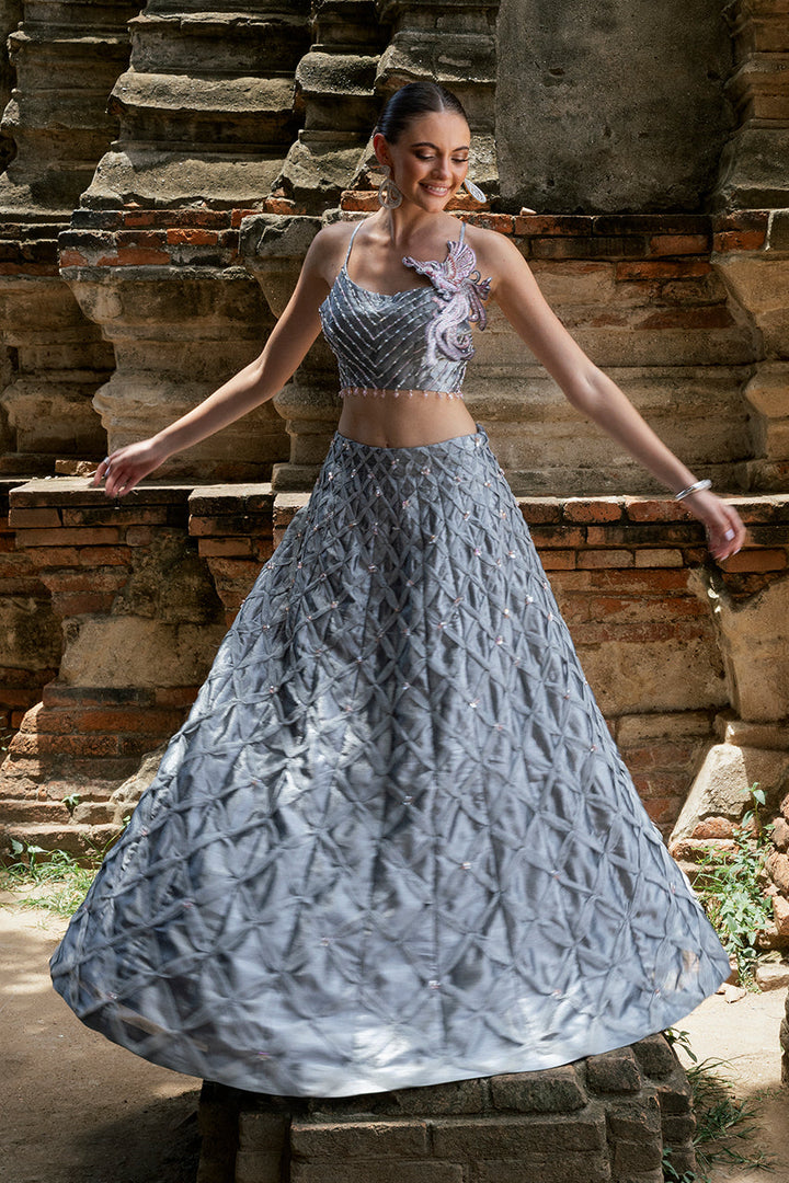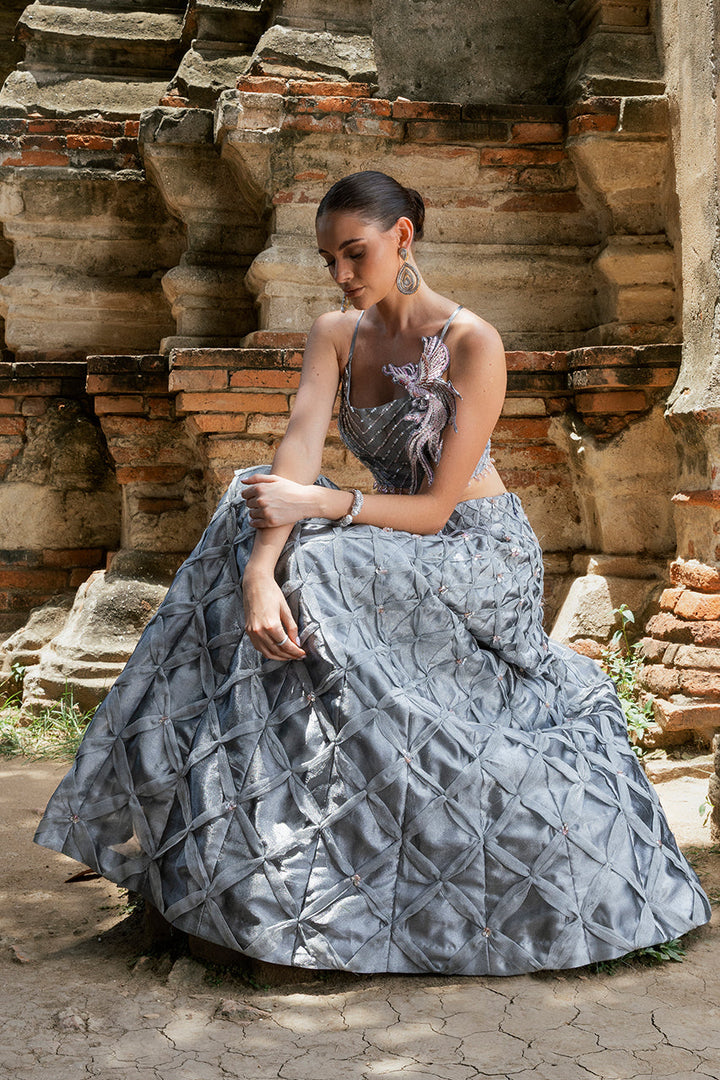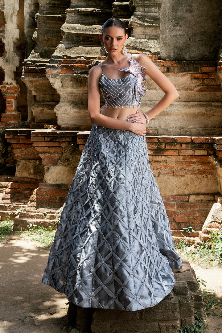 A vision of embellished details, this metallic silk ensemble in silver-grey is a standout. The cropped blouse, with its stunning geometric embellishments in pink crystals and pearls, offers a refined balance of intricate detail and playful design. The bold avian motif on the neckline, detailed with sparkling crystals and pearls, adds an unexpected touch of whimsy, while the crystal fringe along the hem adds a soft, playful finish. Paired with a texture laden lehnga, it complements the top with its pleated lattice pattern, glimmering with crystals at each intersection. This look is perfect for bold, modern celebrations where artistry and playfulness take center stage.