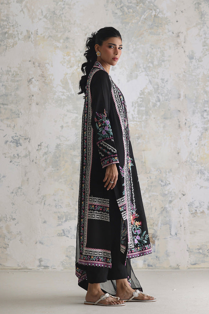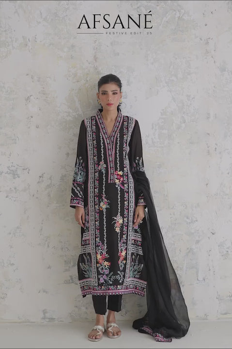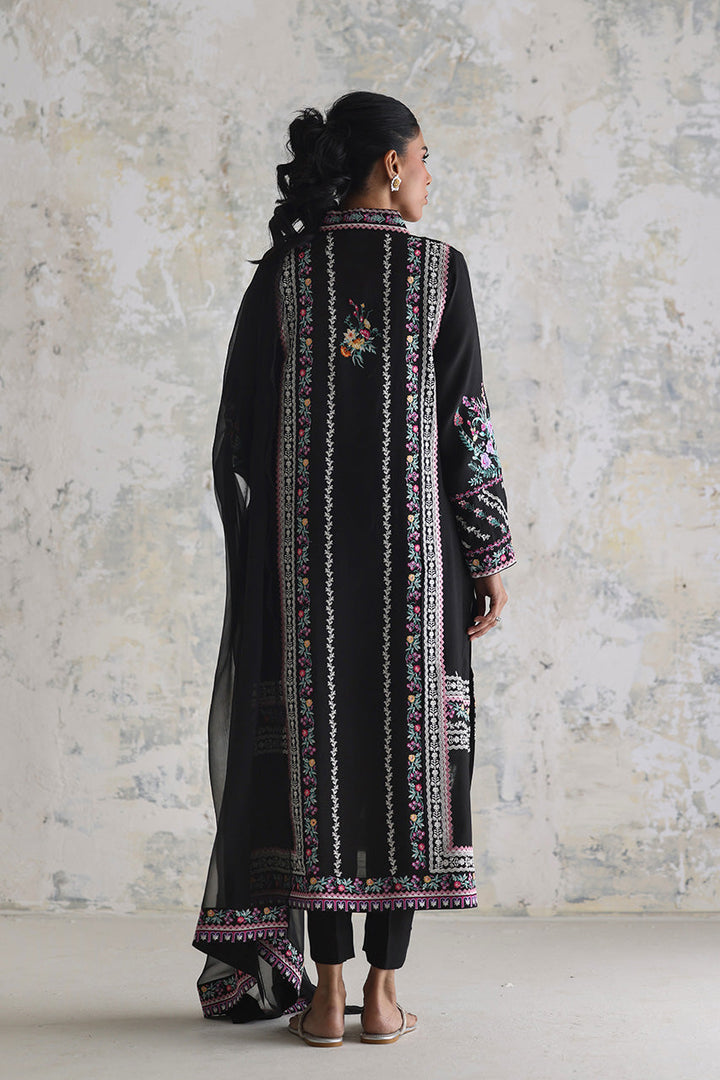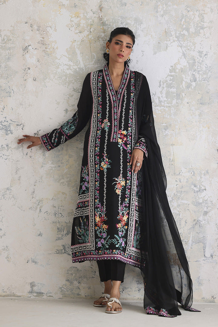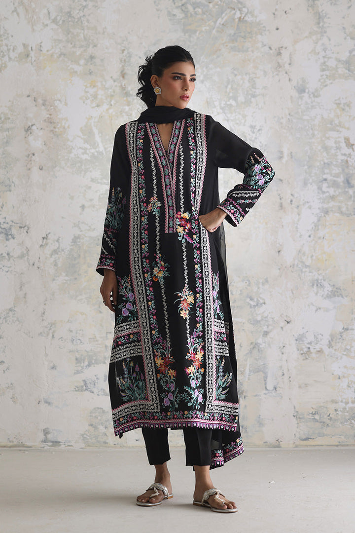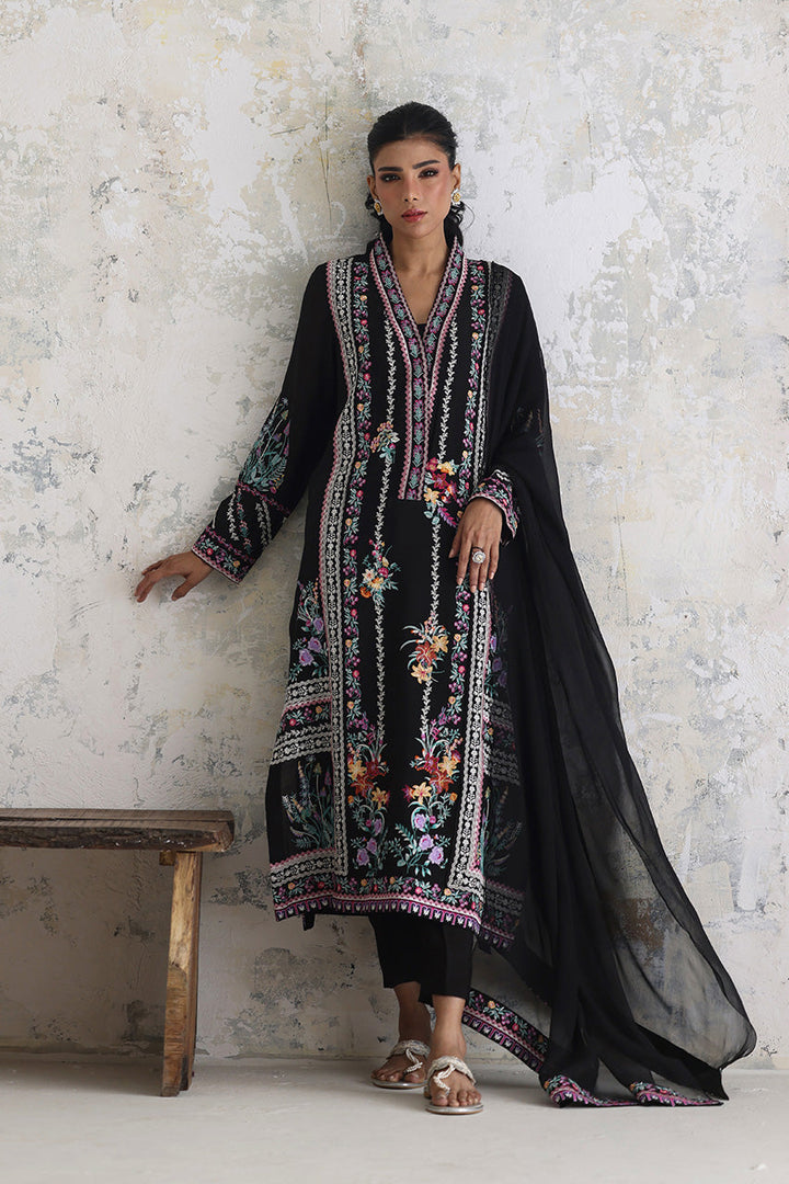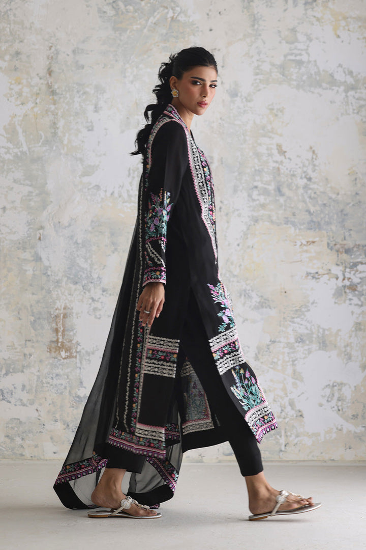 Drenched in meticulous embroidery, this black unwashed kora kameez is adorned with densely placed florals and geometric motifs along the length, with matching detailing on the neckline and hem. The sleeves carry a lighter echo of the embroidery, creating balance without diminishing richness. Vibrant spring hues bring the motifs to life against the deep black ground. Paired with black mota kora pants, the set maintains tonal coherence, while a black chiffon dupatta completes the ensemble, tied in with matching embroidered borders. A classic yet lively option, the look balances richness and precision intentionally.