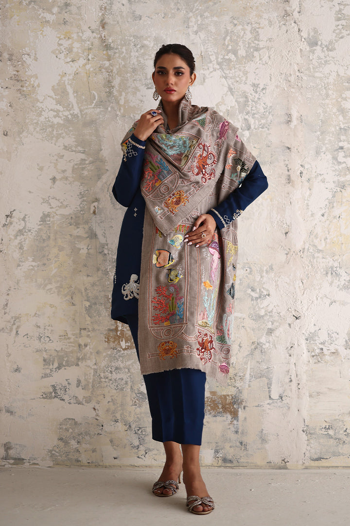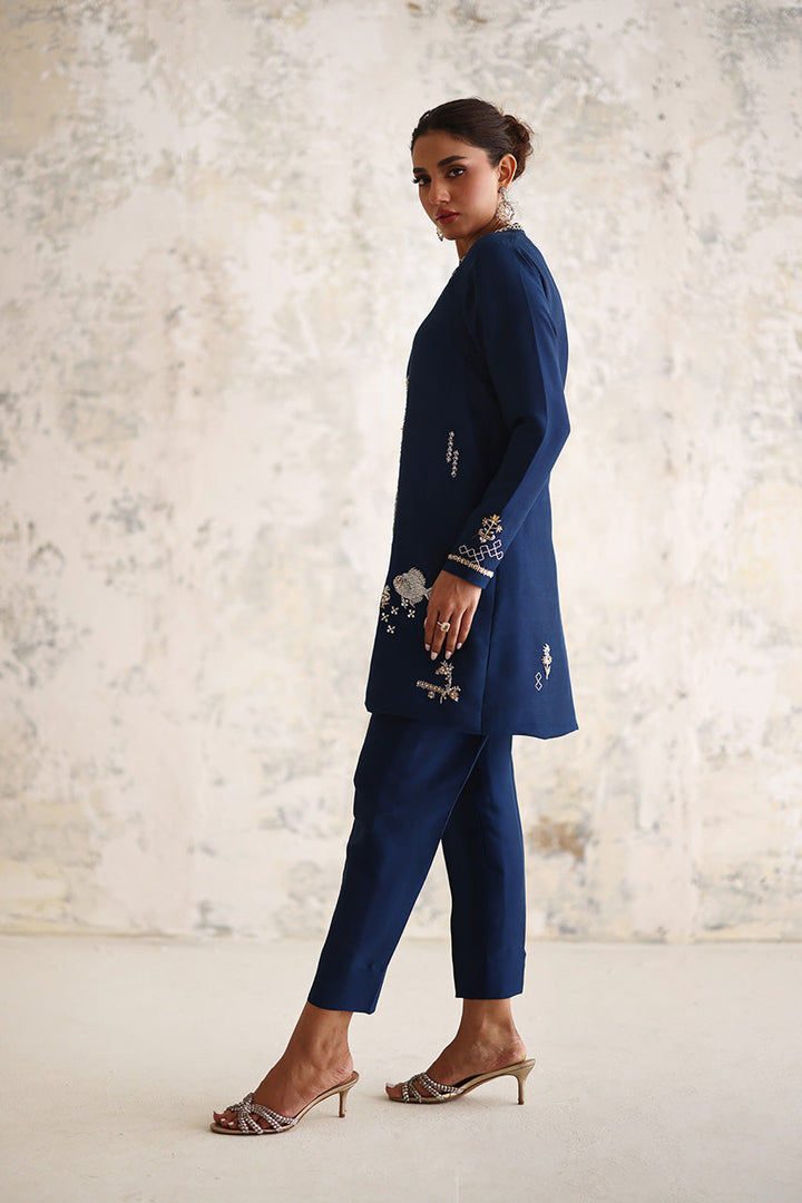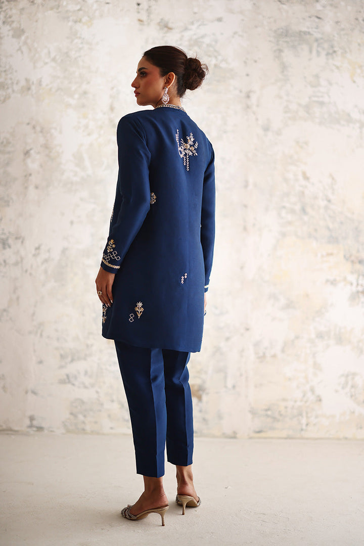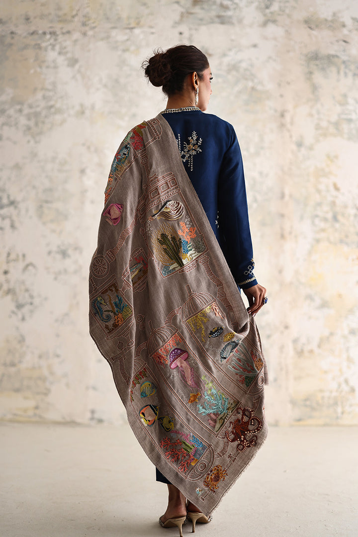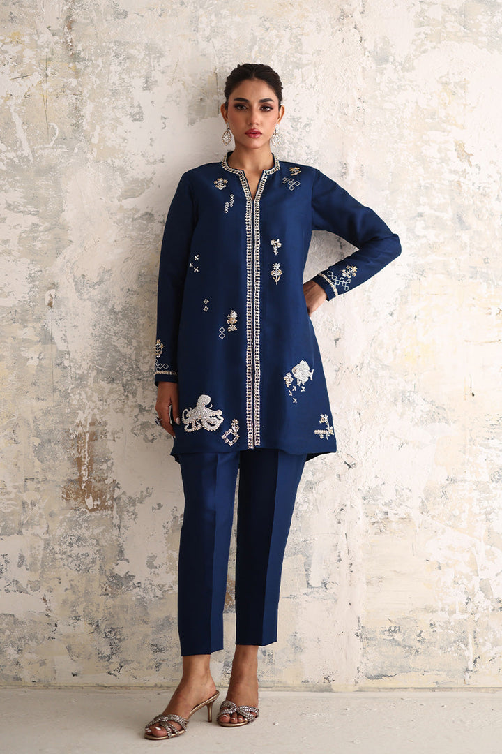 On a deep navy canvas of soft pure silk, delicate hand embroidery brings an aquatic world to life. Silver and gold zardozi, sequins, and beads trace marine flora and fauna along the front and sleeves of the mid-thigh length jacket. The fine geometries on the neckline extend along the length, where tendrils curl and fish glide in quiet rhythm. Balancing the whimsy and structure atop, solid matching sleek pants complete the look. A study in contrast — jewel-toned calm meeting luminous craft.