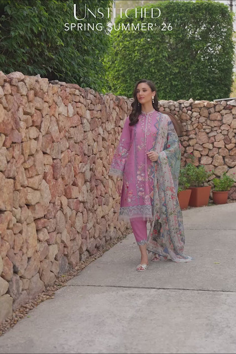 Delivery in 3 - 4 DaysFrench floral sophistication, rendered on purplish pink premium lawn. The shirt fabric is embroidered with soft bouquets, framed with delicate trims for the neckline and embroidered organza borders for the cuffs and hem. Paired with matching bottoms, that come with an embroidered organza insert, and a printed pure silk dupatta, this suit is light, graceful, and easy to carry.
