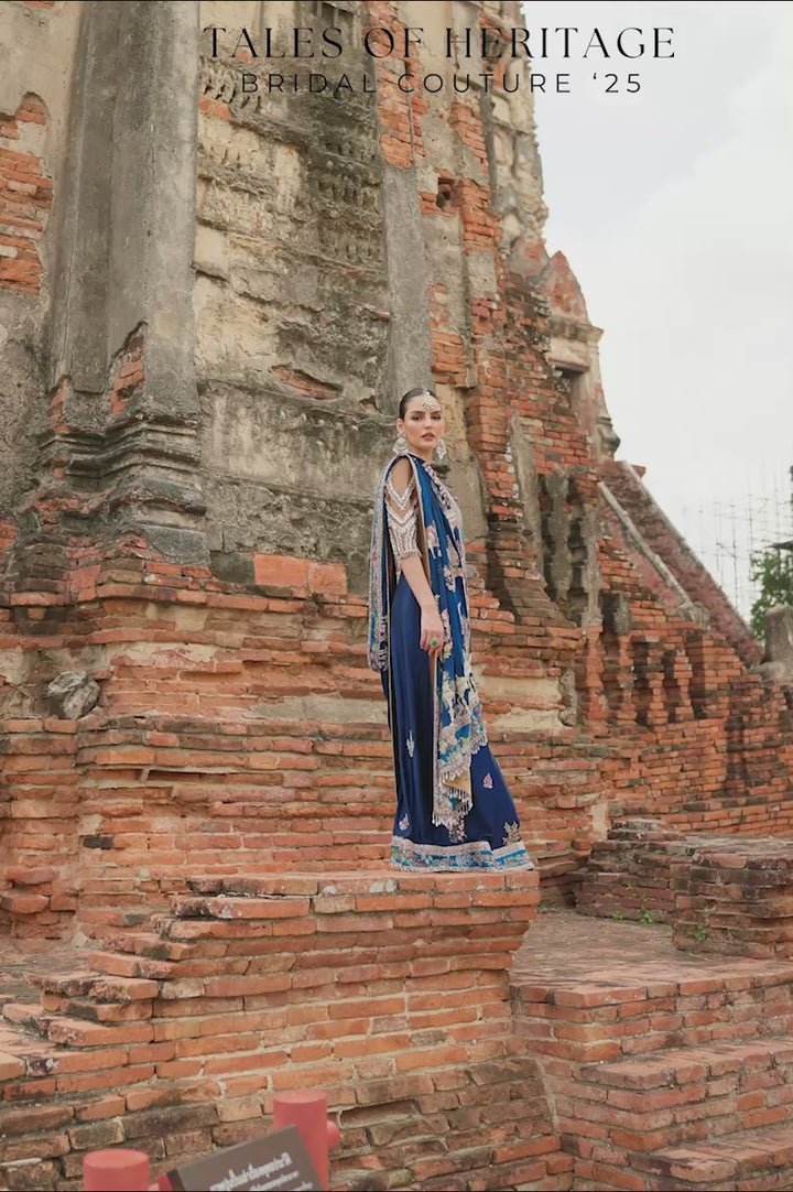 The artistry of handwork comes alive across this saree. Aari embroidery with resham threads builds delicate Mughal architectural patterns, mirrored in the lighter blue borders with precision and depth. Zardozi motifs, clustered at intervals, enrich the pallu, their opulence heightened with strands of crystal that glimmer with movement. The metallic silk blouse is equally crafted, its silver zardozi arranged in symmetrical, linear forms, punctuated with crystals that trace the sleeves and bodice. Each detail carries the mark of skilled artisanship, together shaping a design that radiates richness without excess.
