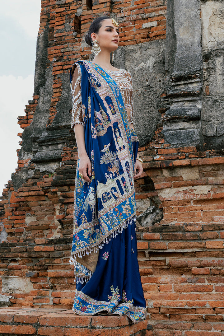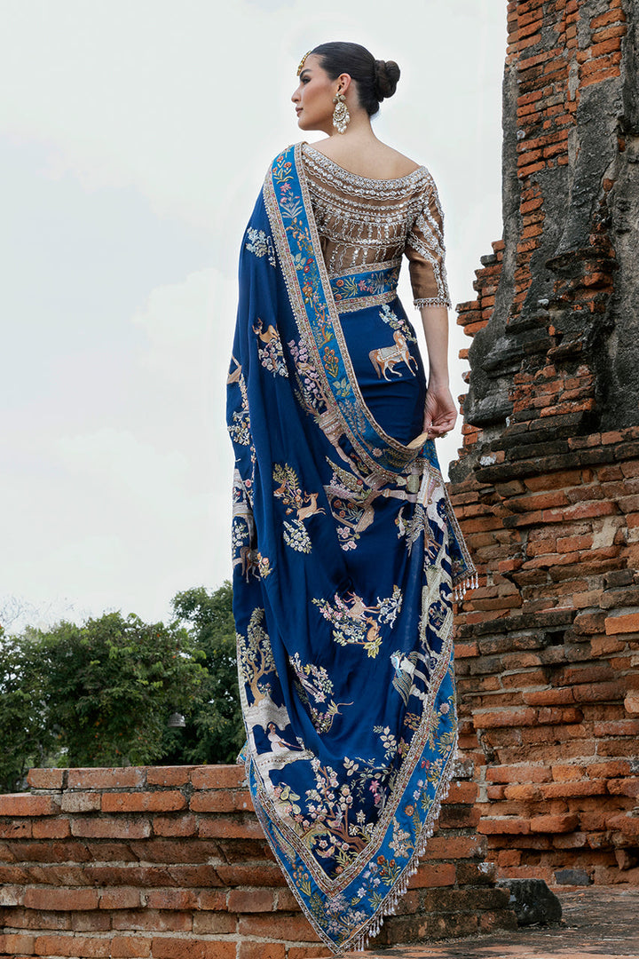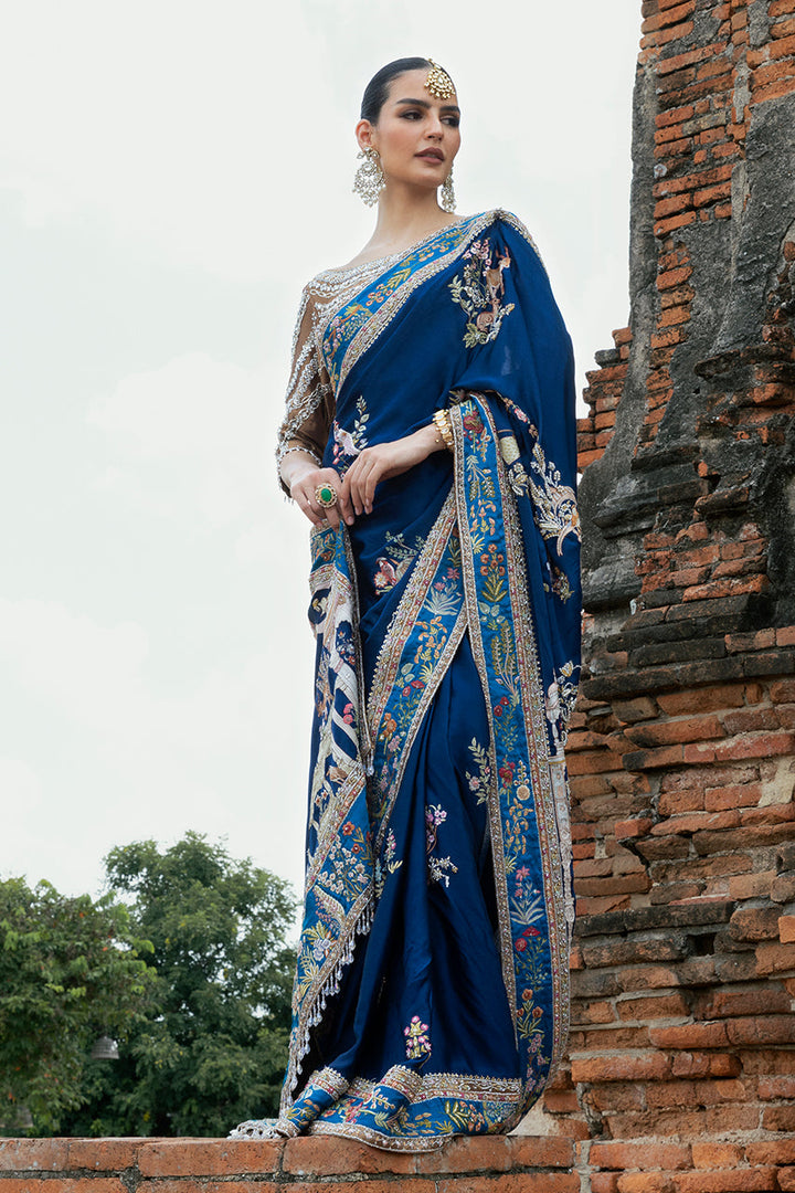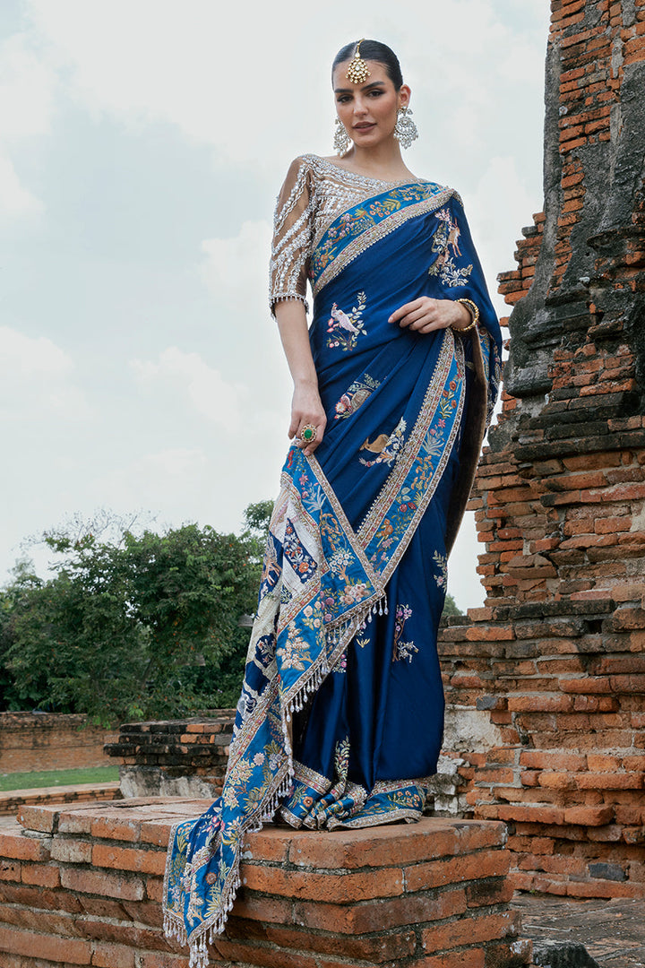 The artistry of handwork comes alive across this saree. Aari embroidery with resham threads builds delicate Mughal architectural patterns, mirrored in the lighter blue borders with precision and depth. Zardozi motifs, clustered at intervals, enrich the pallu, their opulence heightened with strands of crystal that glimmer with movement. The metallic silk blouse is equally crafted, its silver zardozi arranged in symmetrical, linear forms, punctuated with crystals that trace the sleeves and bodice. Each detail carries the mark of skilled artisanship, together shaping a design that radiates richness without excess.