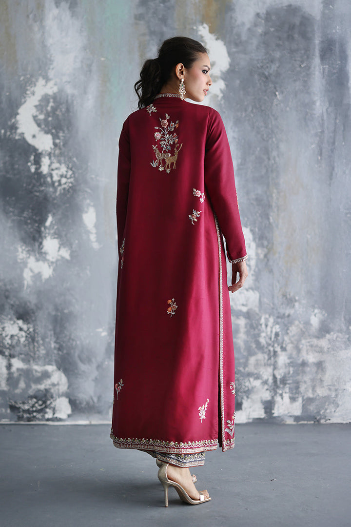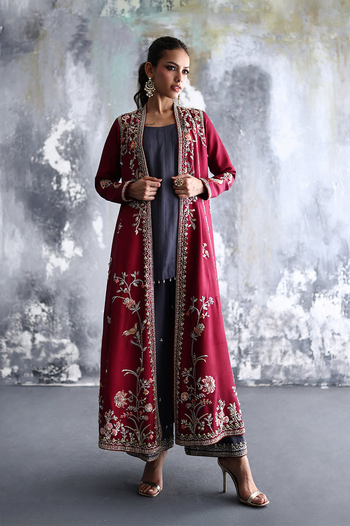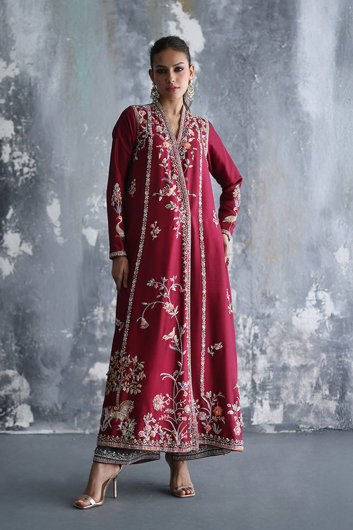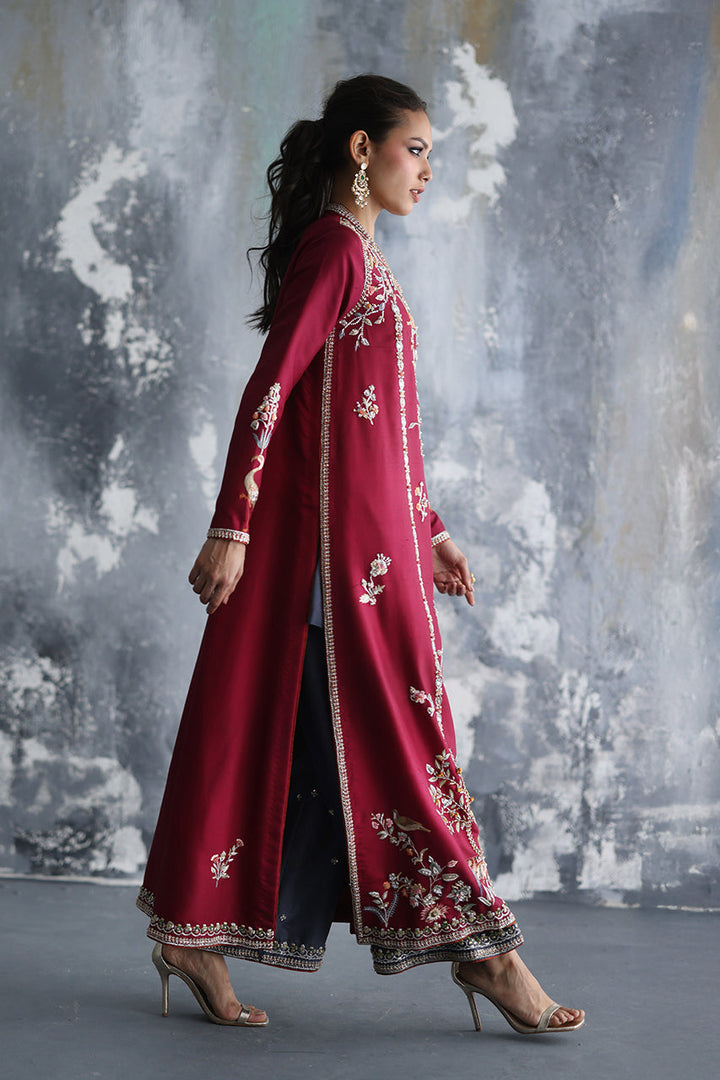 A deep red silk transformed into a garden of gilded craft. From the chogha’s shoulders, flowering vines descend gracefully, winding along the neckline and placket, their zardozi glint of silver and gold softened by corals, pinks, and greys in fine resham hand embroidery. The hems bloom with sprouting florals, reaching upward in mirrored rhythm, while drifting bouquets and columns of luminous craft ripple through the length, each motif enriched with sequins and beads. The sleeves carry a whisper of whimsy — resham flamingoes, hand-embroidered in intricate detail, clasp tiny bouquets. Metallic sheen of zardozi, sequins, and bead trace patterns from the neckline, down the front and along the hem. Symphony of this texture continued in the paired gray silk izaar, its hems echoing the gilded borders. Completed with a short pintucked camisole finished with a crystal drops on the hem, this look marries color play with meticulous craft.