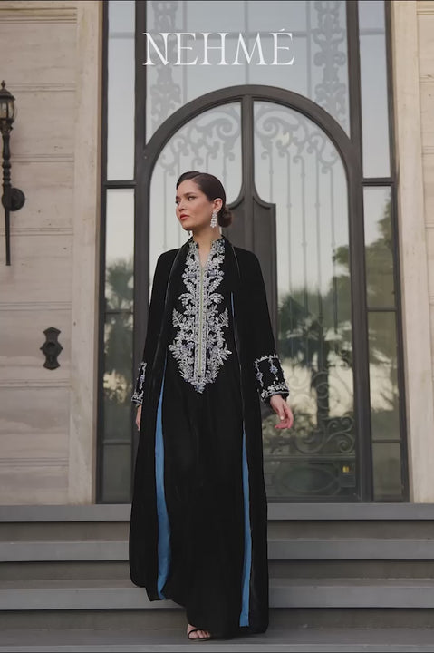 This velvet kaftan moves with an unhurried grace. The black expanse of its soft form is intricately marked with botanical beauty. Florals, arranged in balanced harmony, adorn the neckline and sleeves, hand-embellished with sequins, beads, crystals, and fabric florals with hints of silver zardozi. Cool-toned accents lend color to the sparkling texture, completing the atelier’s signature of restraint and layered detail.