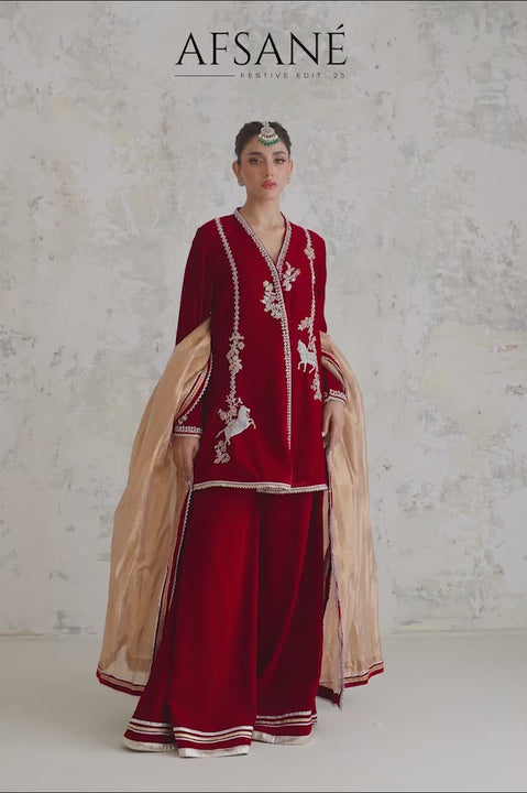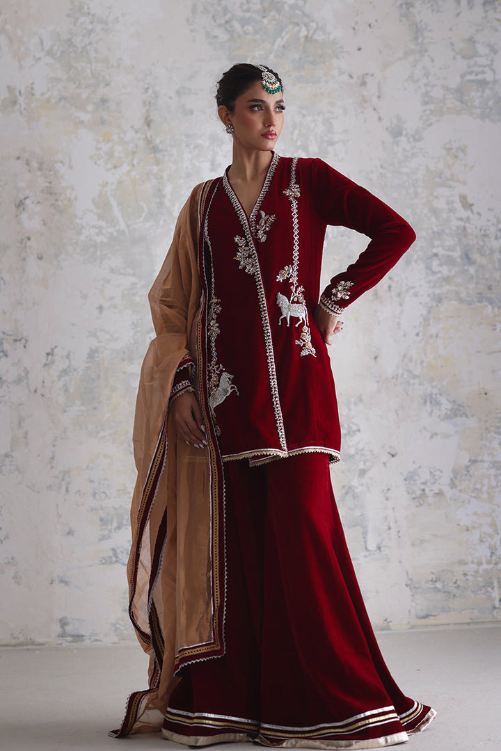 A study in regal poise, this maroon velvet aba draws from Mughal splendor while keeping its modern aesthetic intact. The short, A-line cut carries delicate handcrafted zardozi detailing in silver and gold, where ornate equine motifs intertwine with delicate geometries and floral tendrils across the length and sleeve hems. Sequins and beads lend a quiet radiance, white metallic gota and lace tracing the hem and sleeves add a glimmering frame. Paired with matching velvet dhaka pants, glistening with gota enriched hems, and an airy copper tissue silk dupatta bordered in matching velvet, gota, and trims, the ensemble finds balance between richness and refinement — tradition reinterpreted with measured grace.