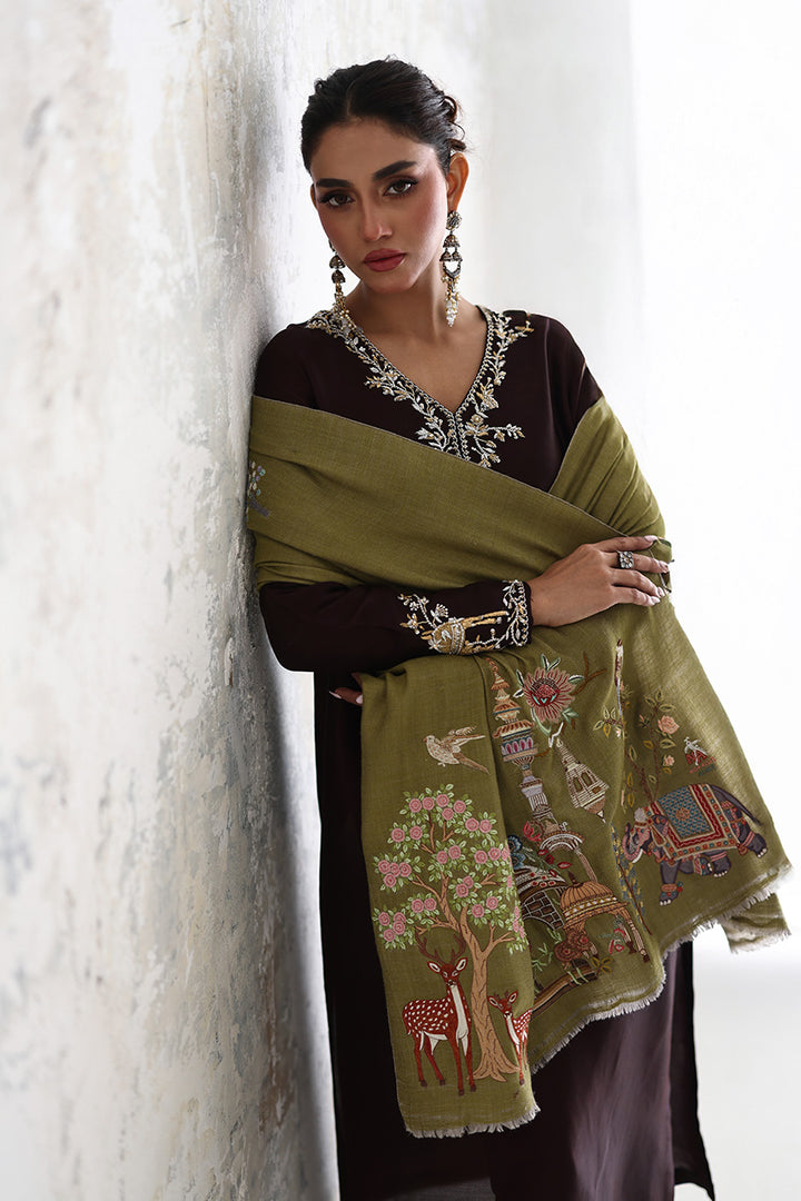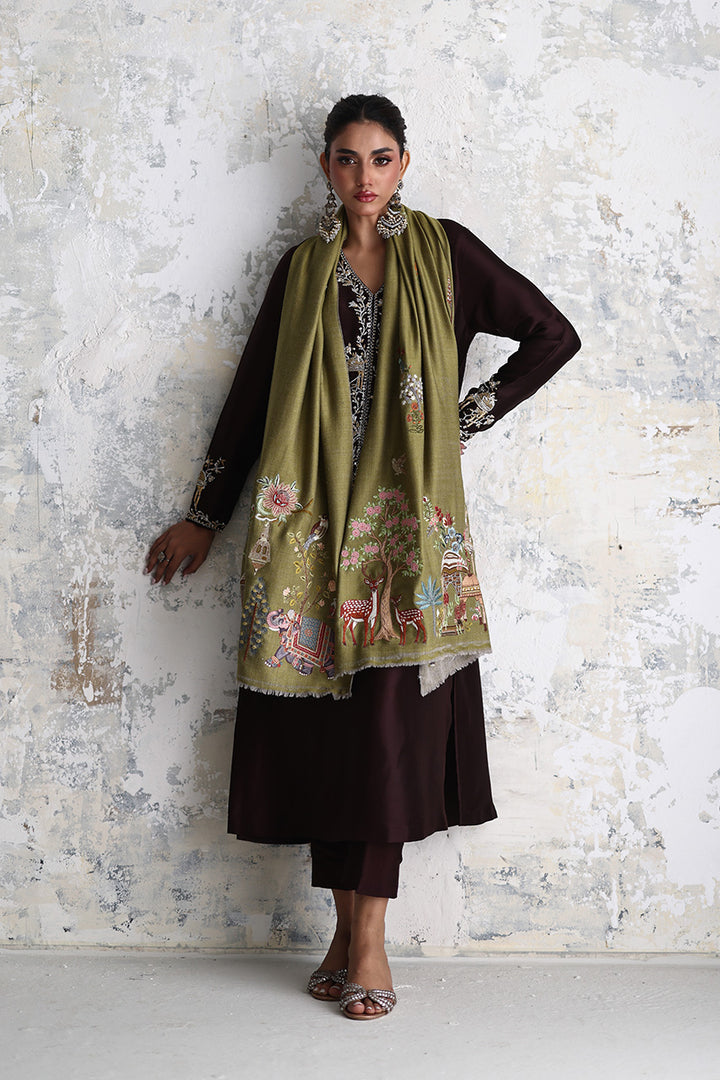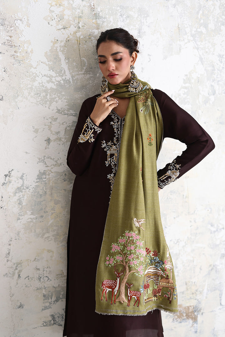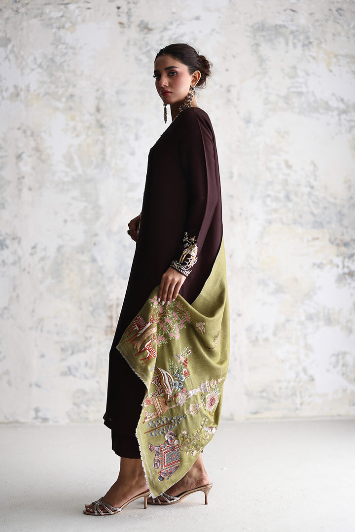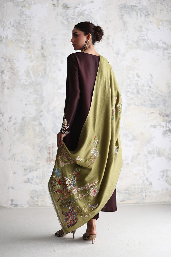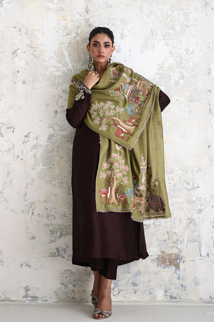 In a soft khaki green/muted mustard, this pashmina stole exudes quiet luxury. Vibrant aari embroidery captures Mughal inspired chinoiserie in playful yet composed arrangements, heavier at the pallus and delicately mirrored at the center. The overall effect is harmonious and refined, transforming a warm accessory into a statement of timeless artistry.