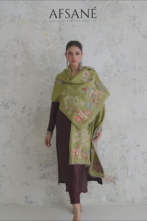 In a soft green/muted mustard, this pashmina stole exudes quiet luxury. Vibrant aari embroidery captures Mughal inspired chinoiserie in playful yet composed arrangements, heavier at the pallus and delicately mirrored at the center. The overall effect is harmonious and refined, transforming a warm accessory into a statement of timeless artistry.